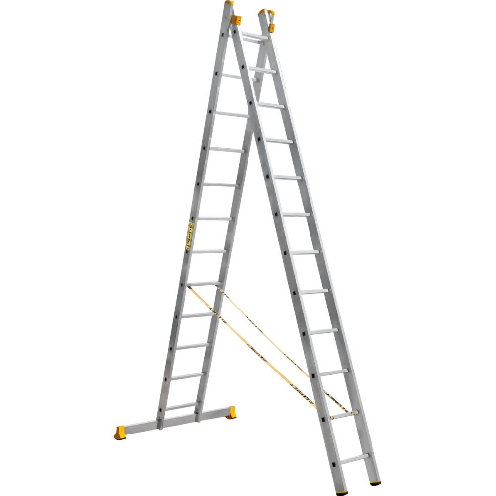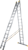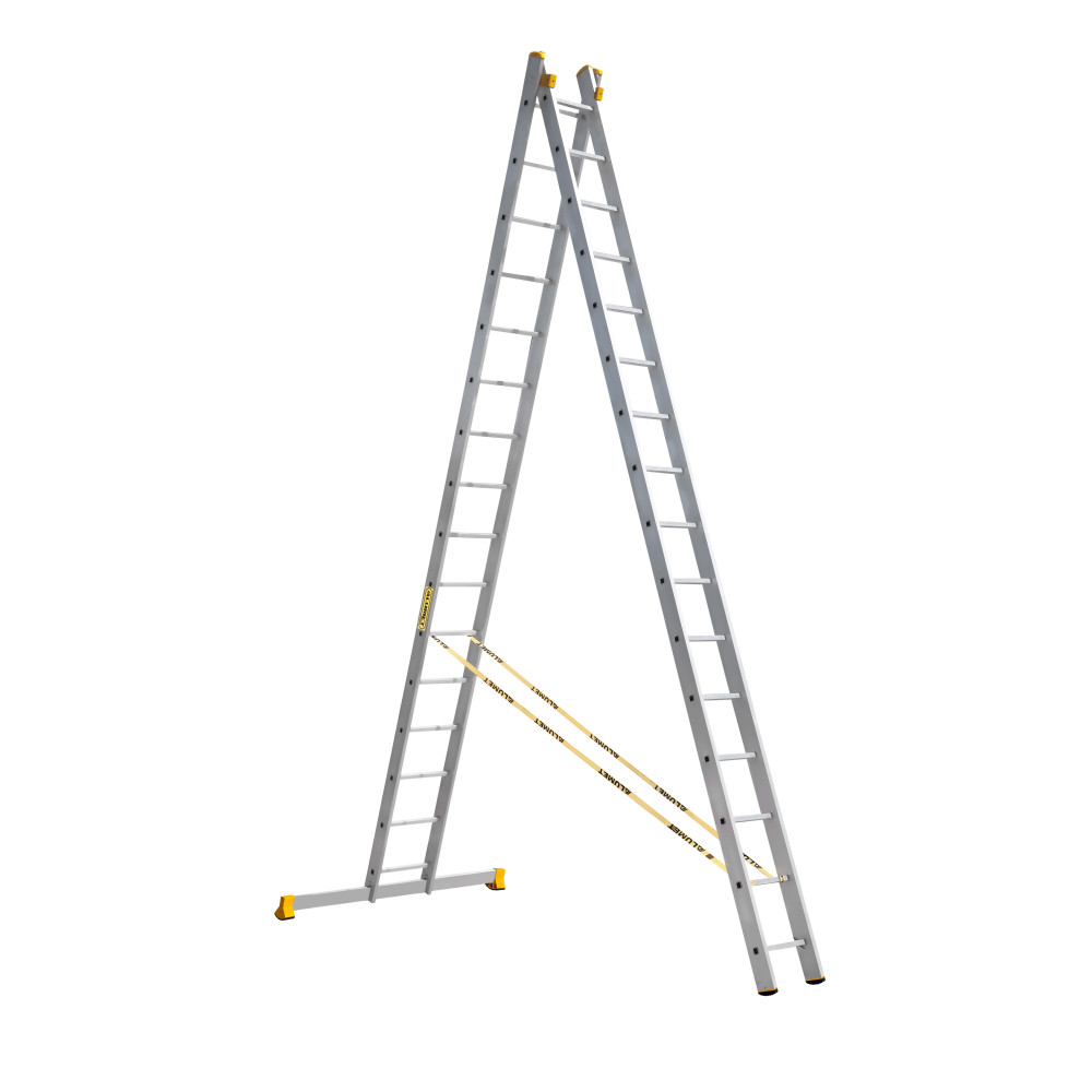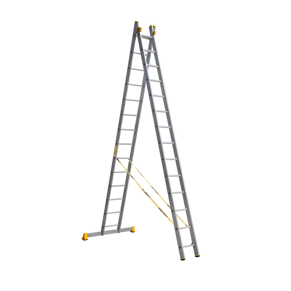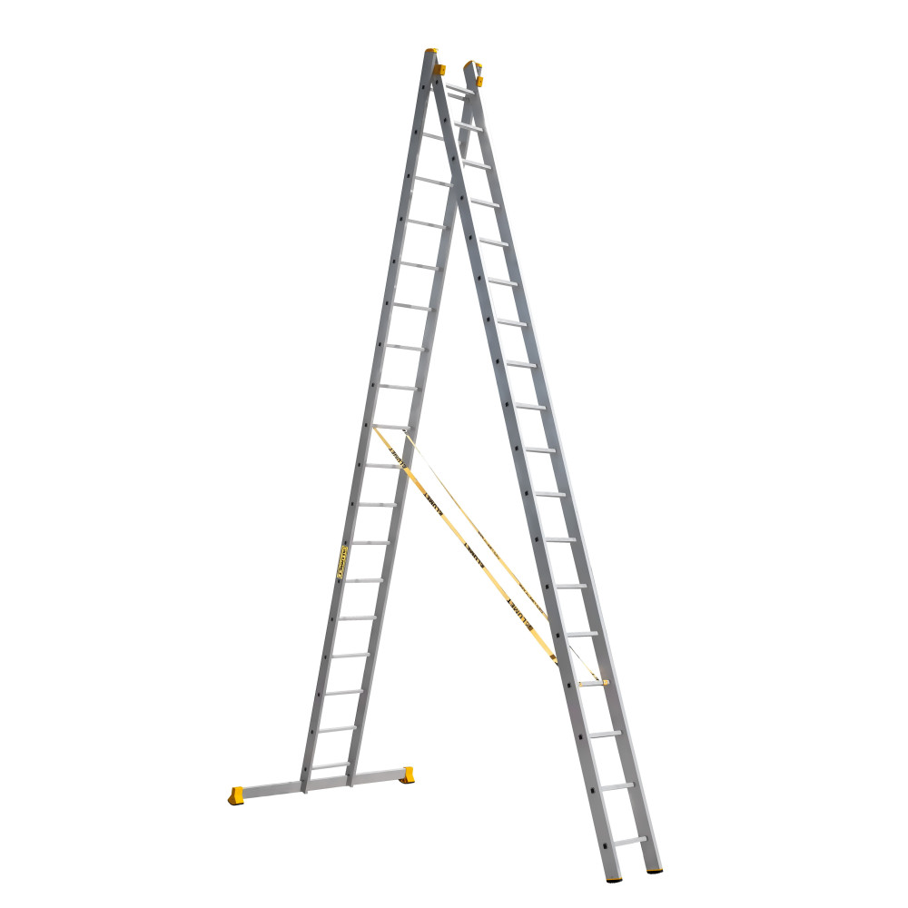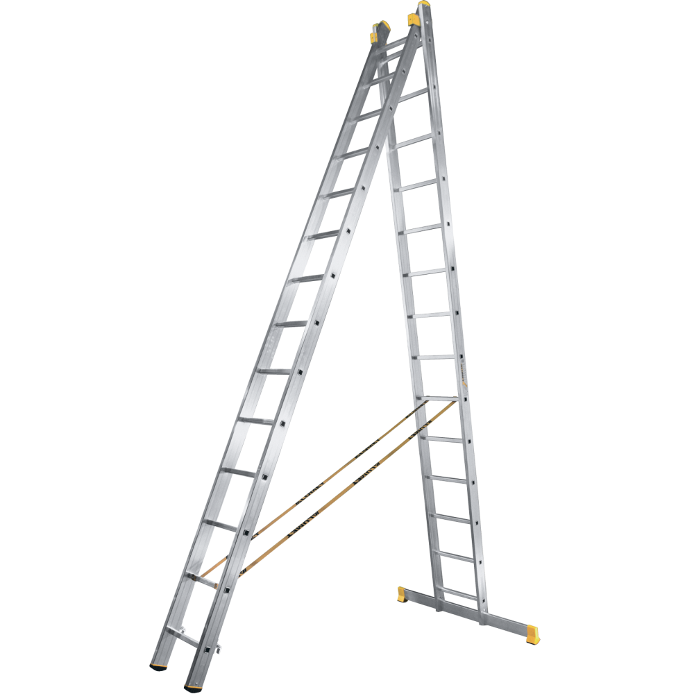 The reliability of an extension ladder is ensured by an overlap of the sections, which makes it structurally more complicated, heavier and therefore more expensive compared to a single section ladder. Safety ropes keep the ladder from ‘sprawling’ in the ‘twin step ladder’ configuration. They also provide the required overlap in the ‘extension ladder’ configuration. It is a conjoint design, so it is impossible to use each of the two ladder elements separately.