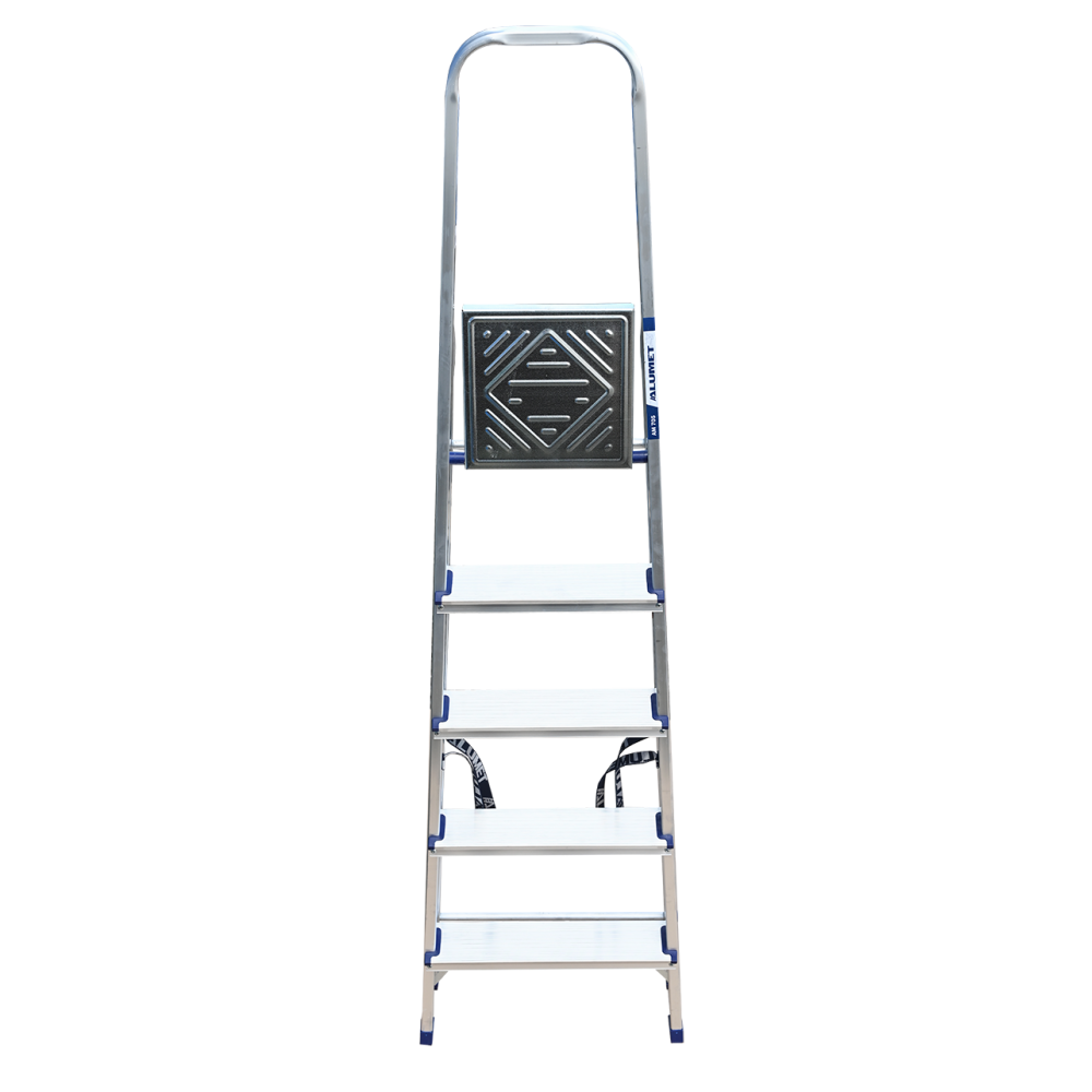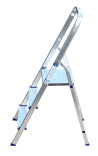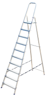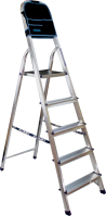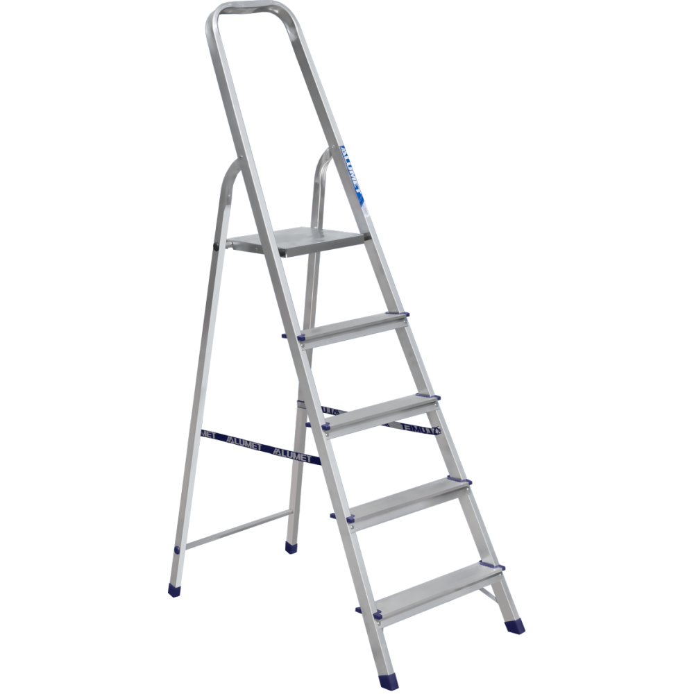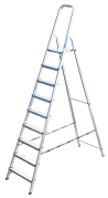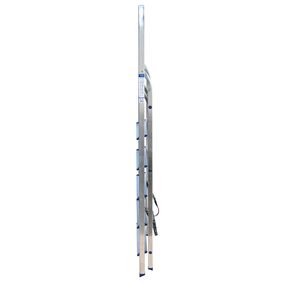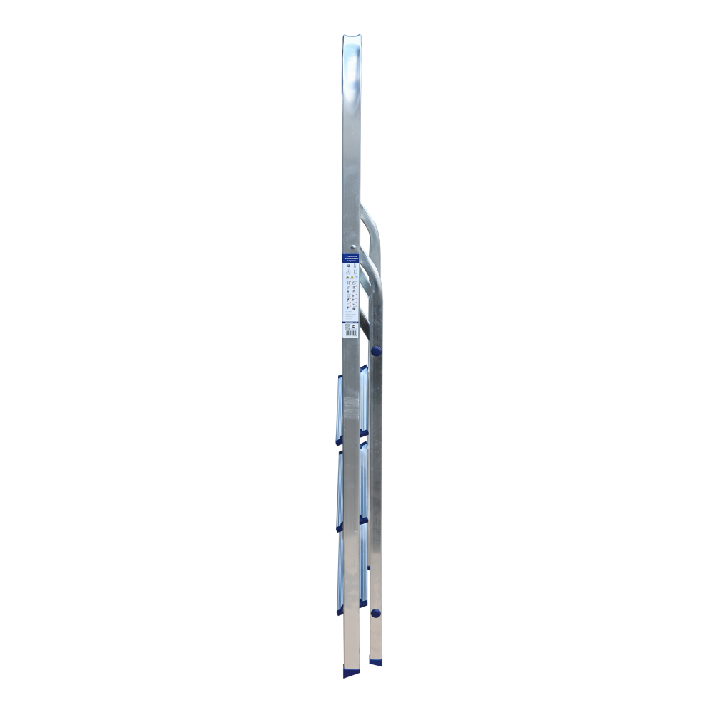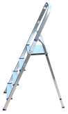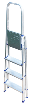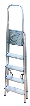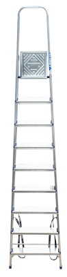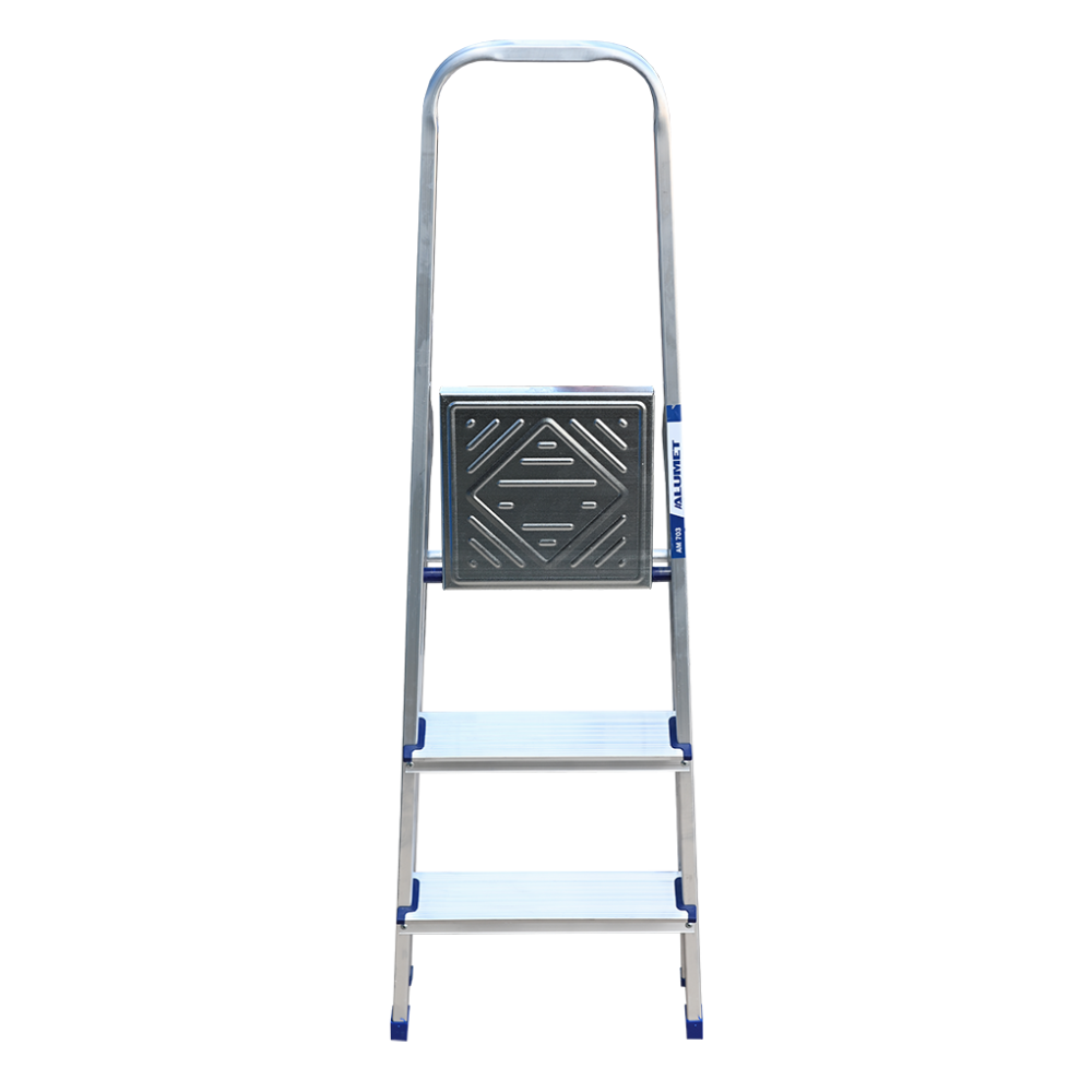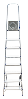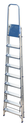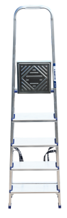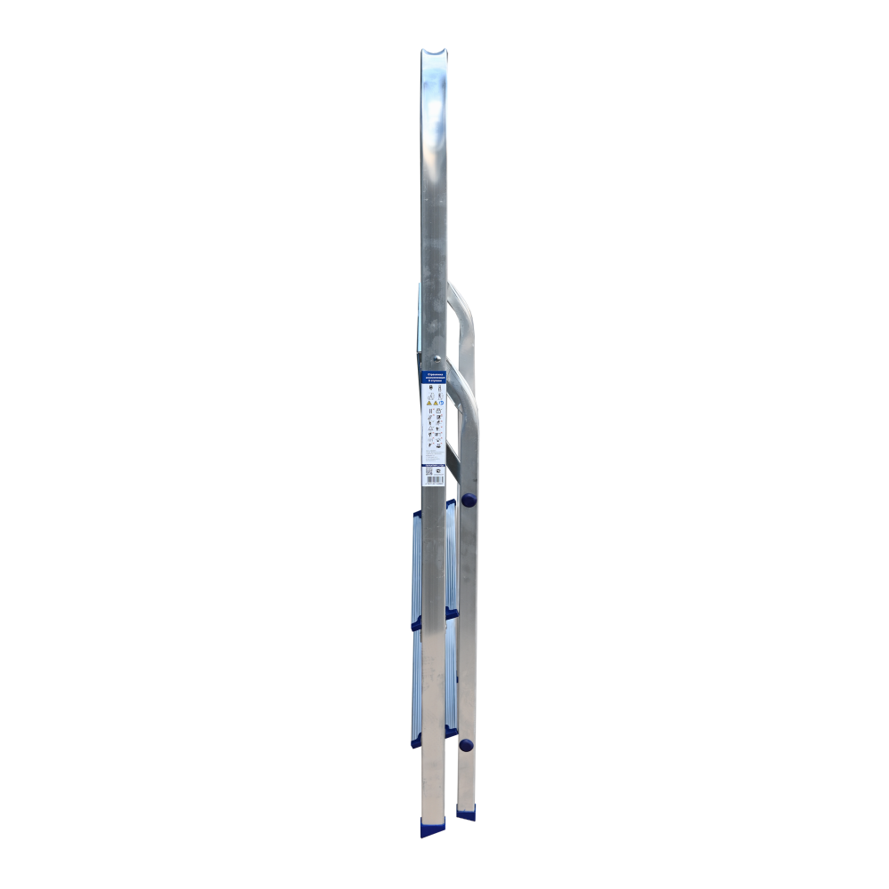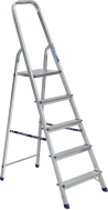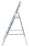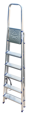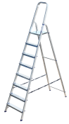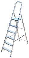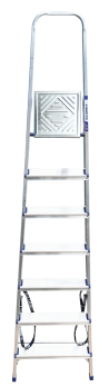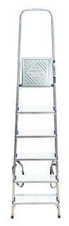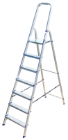 The aluminum step ladder is made of high-strength aluminum shape. The back and front legs are interconnected. The work platform is made of galvanized steel. The rungs have a serrated surface. The shoes are made of high strength plastic. The step ladder in the working position is secured by the work platform; and for step ladders with five rungs and higher – by safety ropes. The number of rungs – from 3 to 10. AM series aluminum step ladder is designed for various types of domestic and industrial work at a height of up to 4 m.