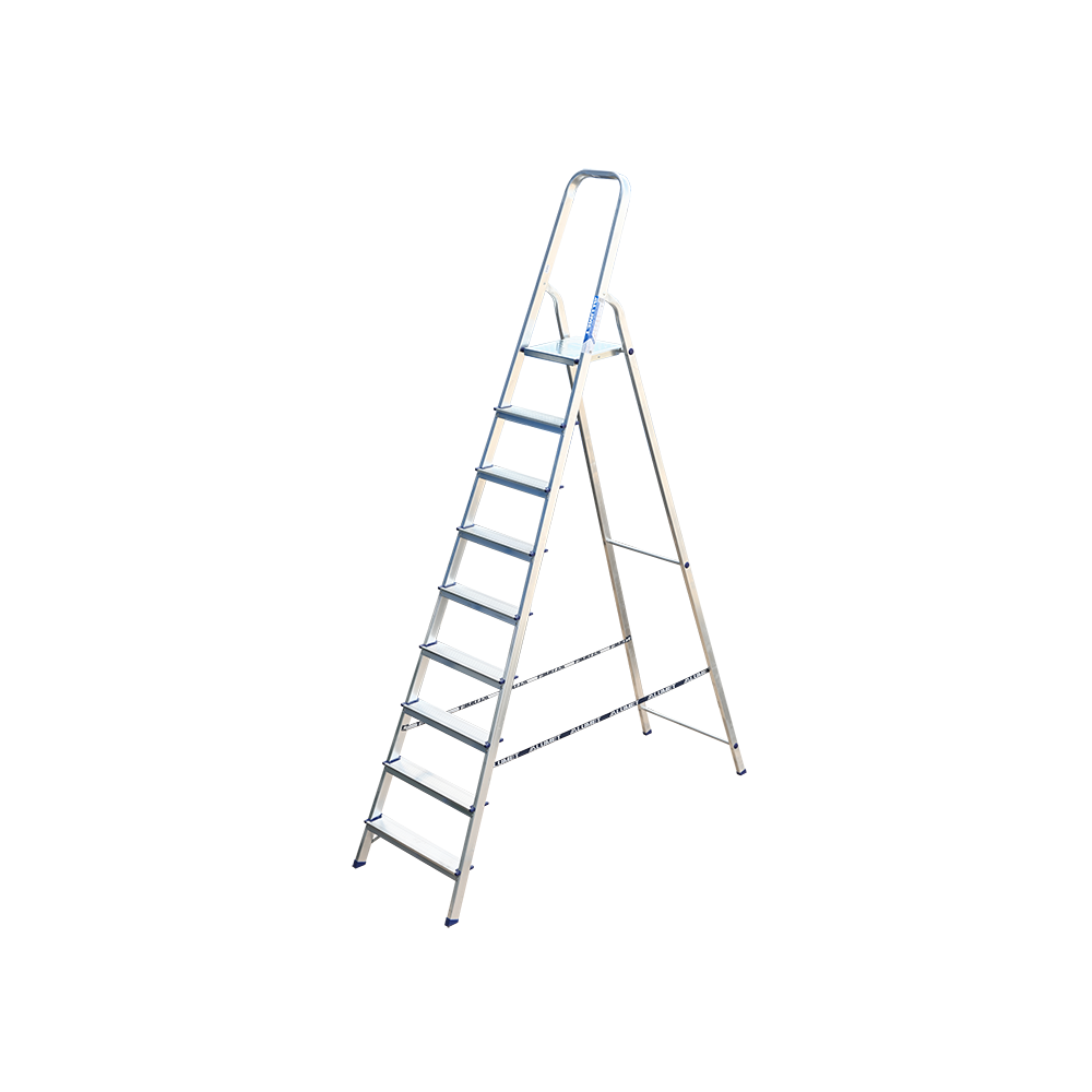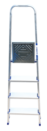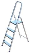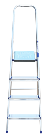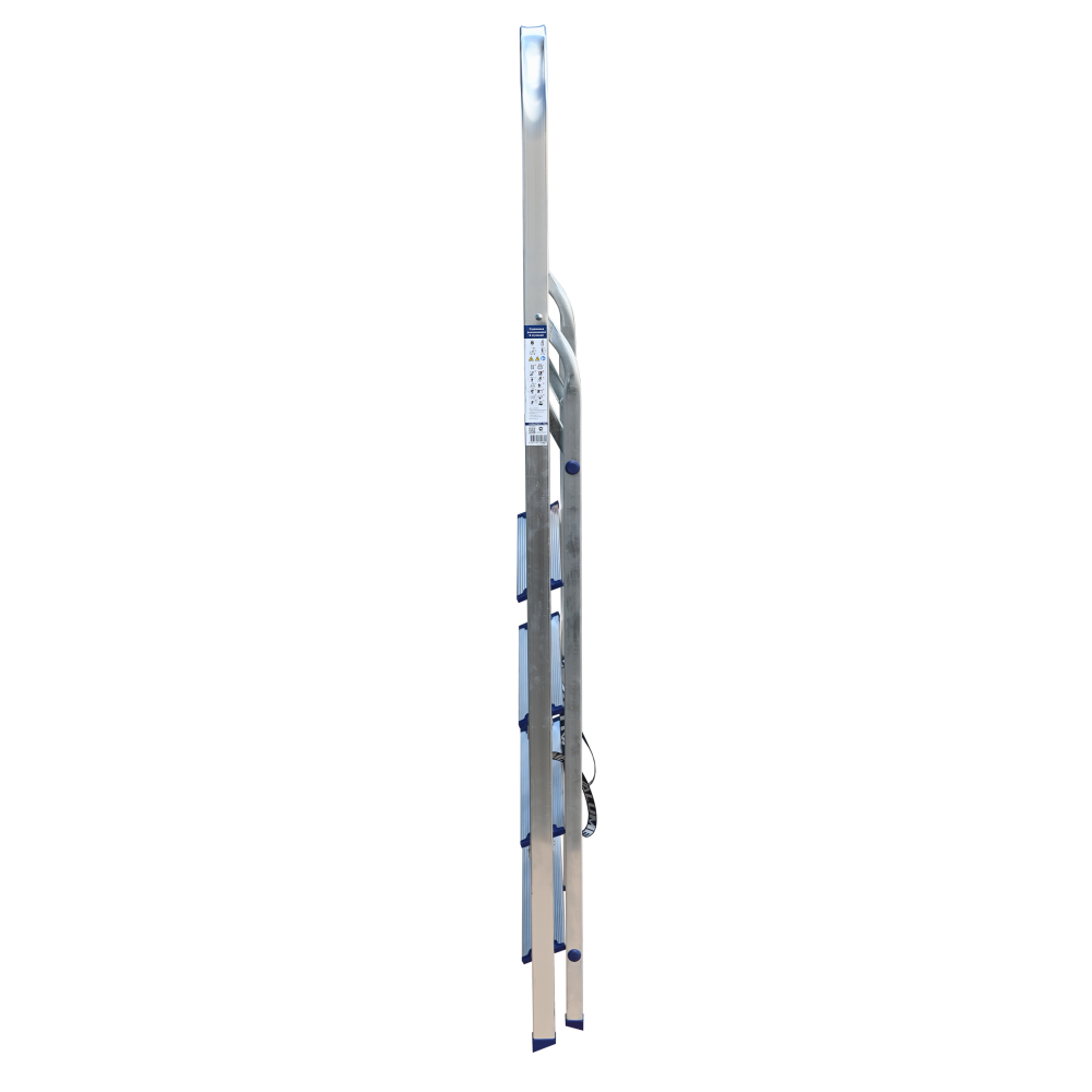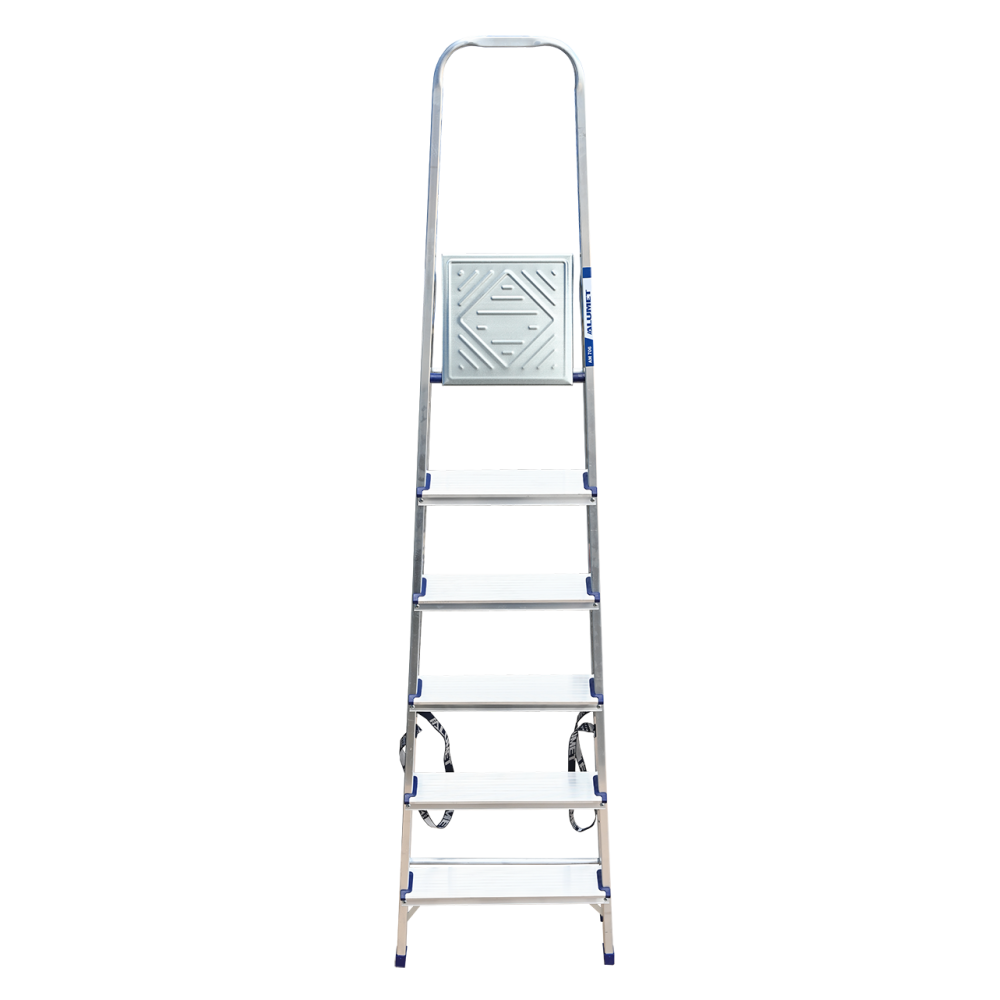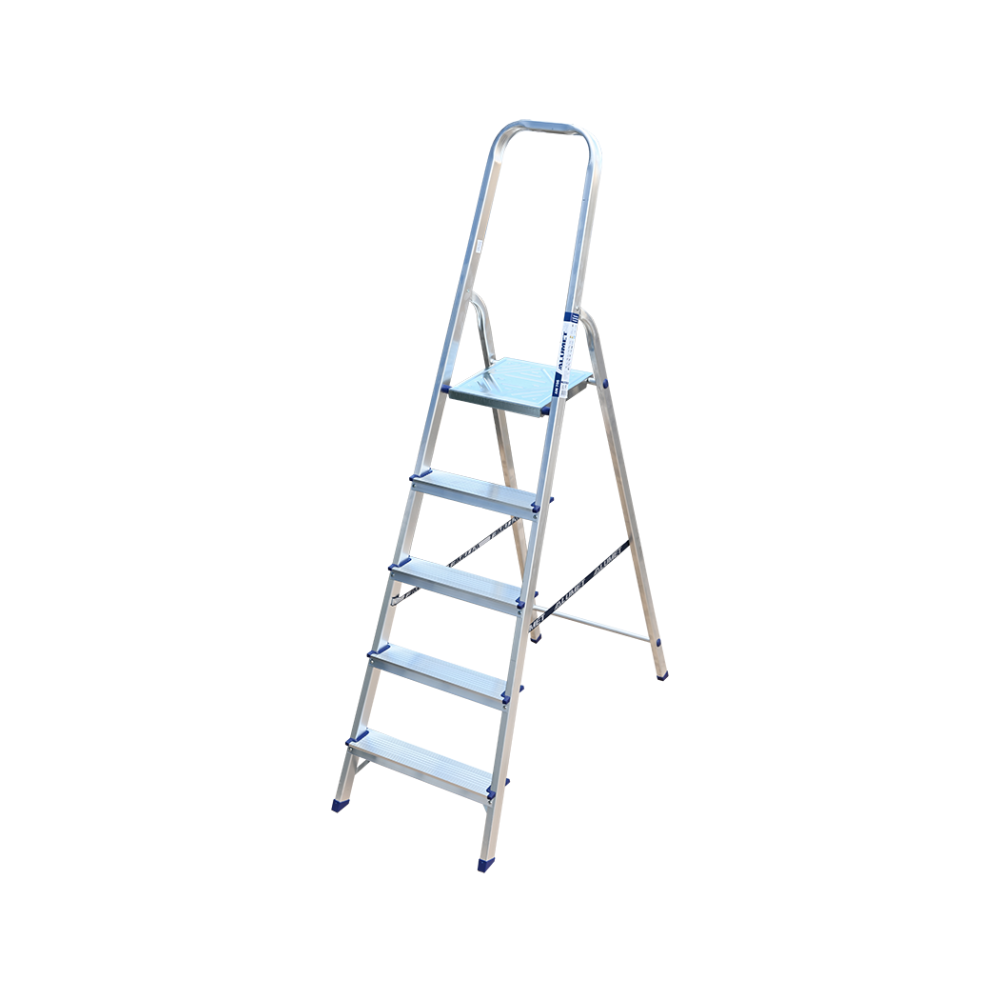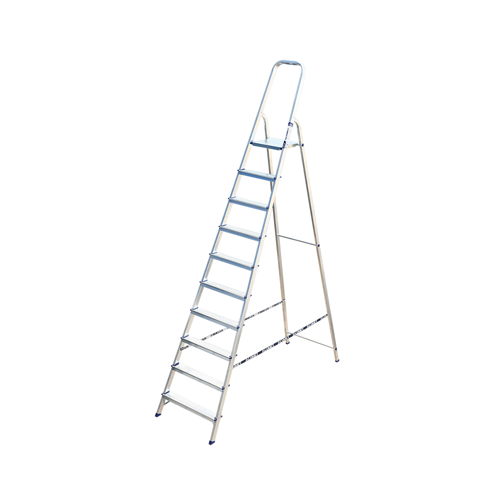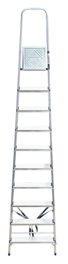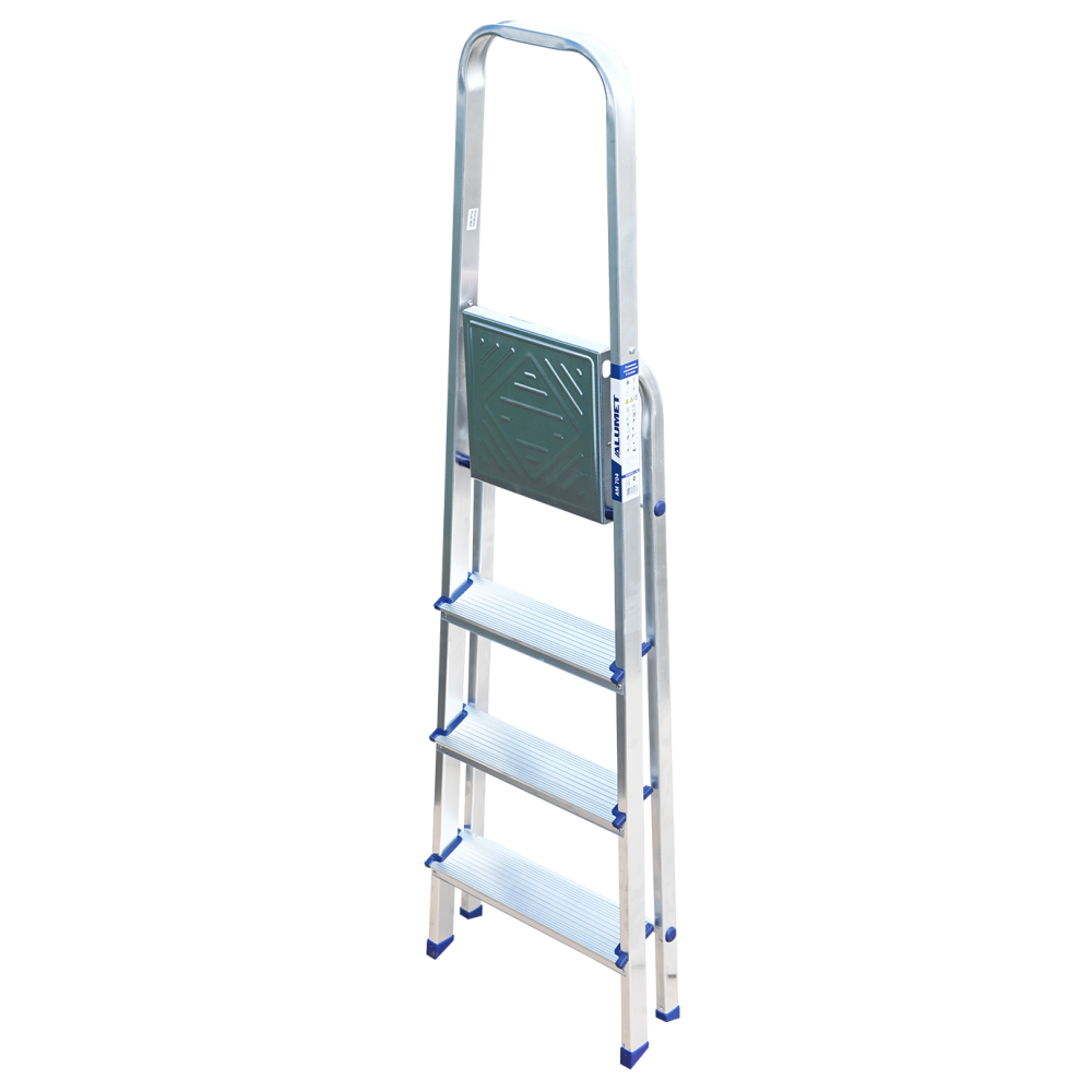 The aluminum step ladder is made of high-strength aluminum shape. The back and front legs are interconnected. The work platform is made of galvanized steel. The rungs have a serrated surface. The shoes are made of high strength plastic. The step ladder in the working position is secured by the work platform; and for step ladders with five rungs and higher – by safety ropes. The number of rungs – from 3 to 10. AM series aluminum step ladder is designed for various types of domestic and industrial work at a height of up to 4 m.