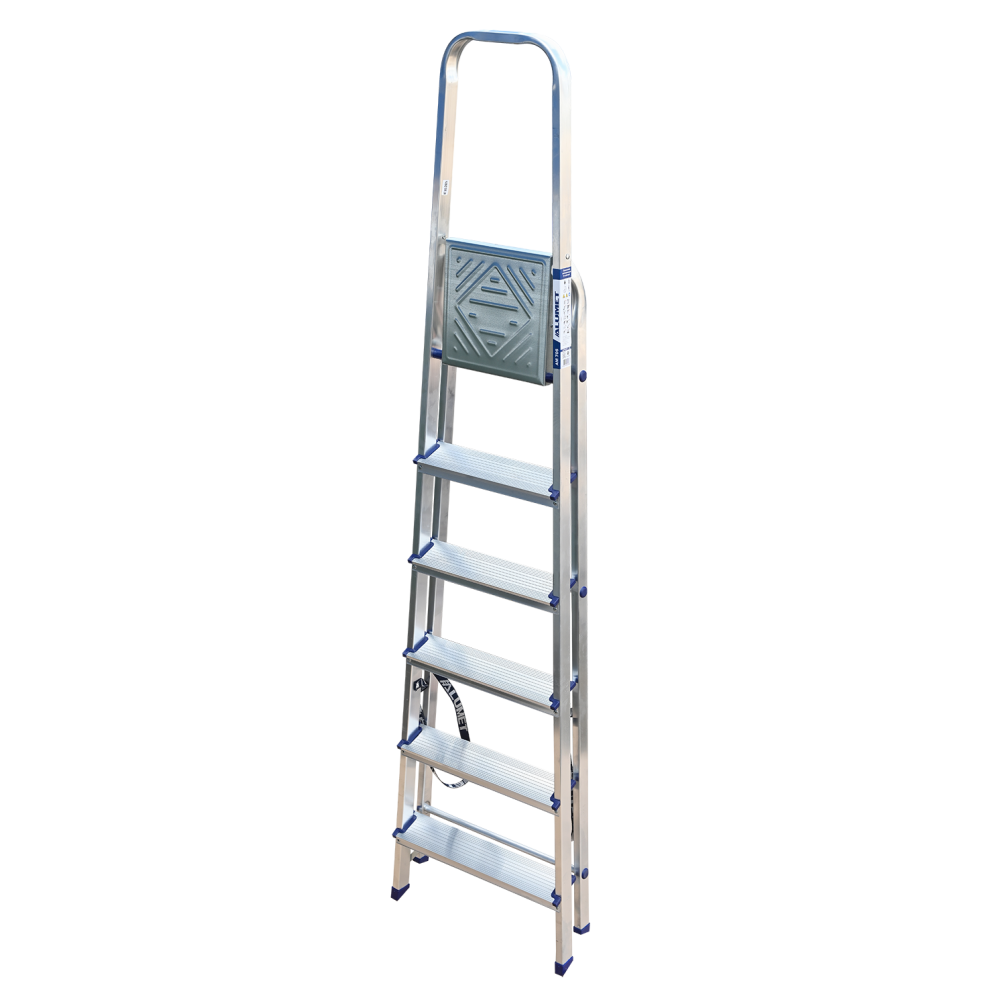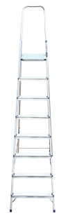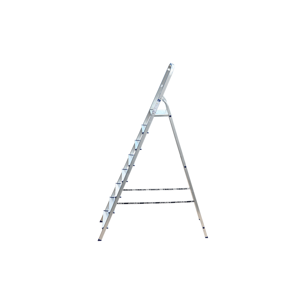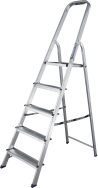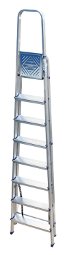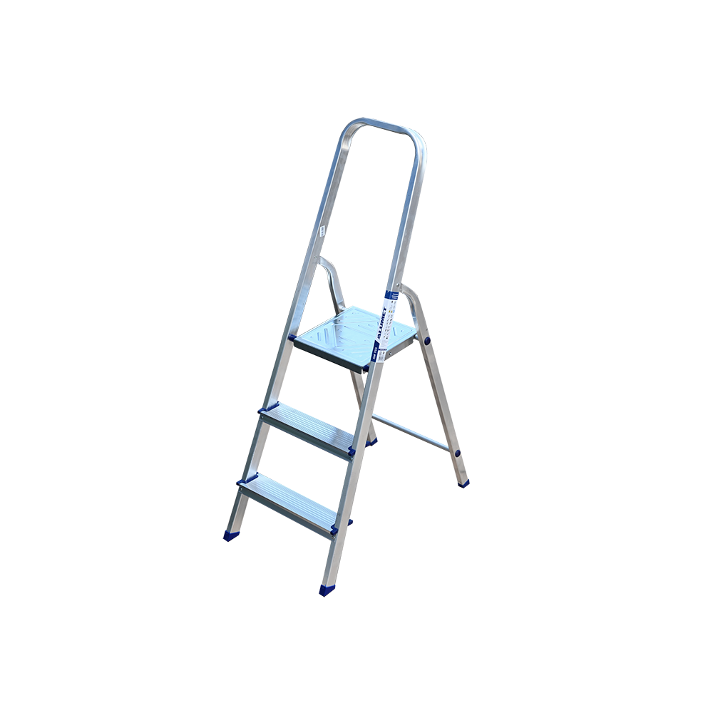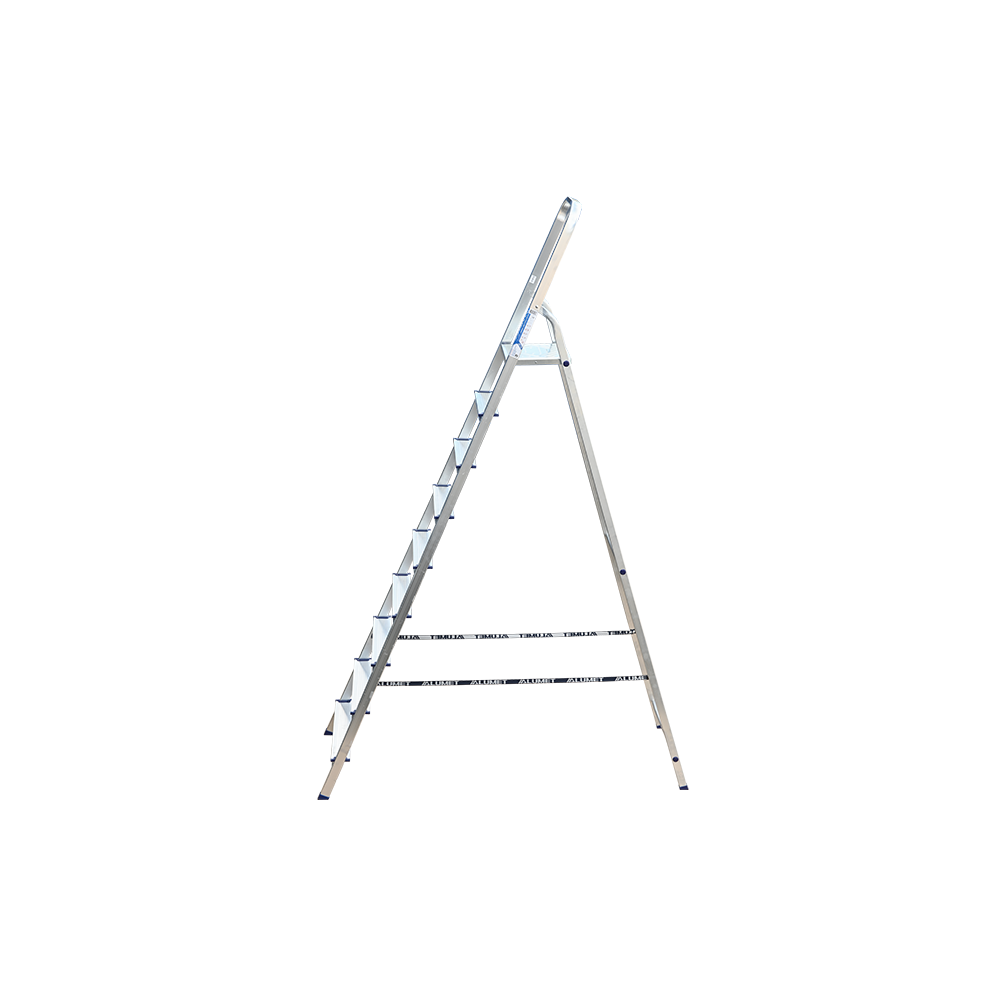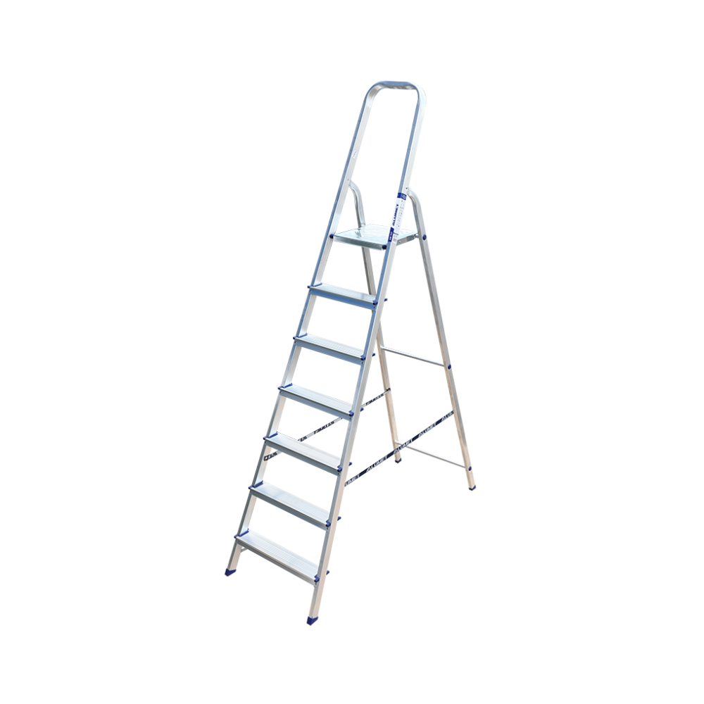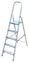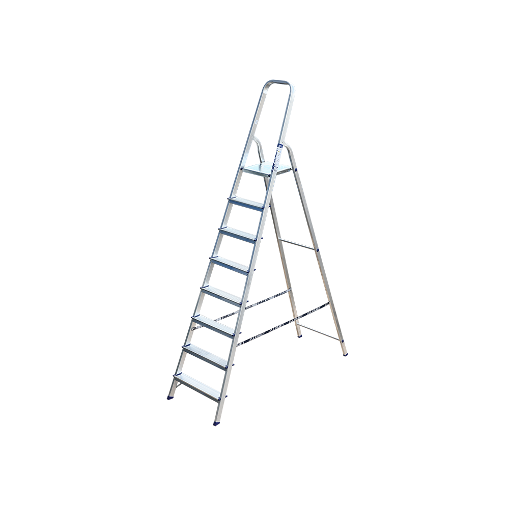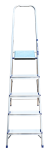 The aluminum step ladder is made of high-strength aluminum shape. The back and front legs are interconnected. The work platform is made of galvanized steel. The rungs have a serrated surface. The shoes are made of high strength plastic. The step ladder in the working position is secured by the work platform; and for step ladders with five rungs and higher – by safety ropes. The number of rungs – from 3 to 10. AM series aluminum step ladder is designed for various types of domestic and industrial work at a height of up to 4 m.
