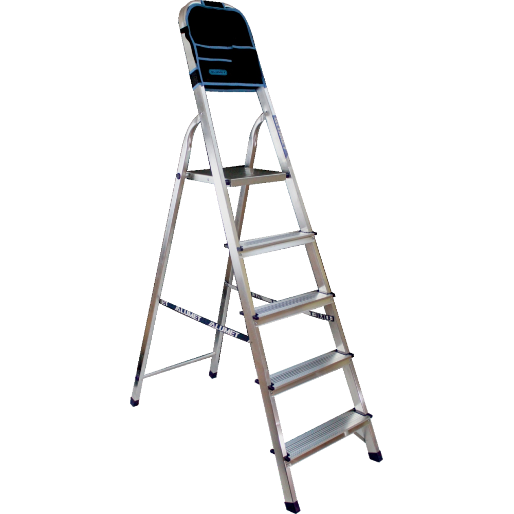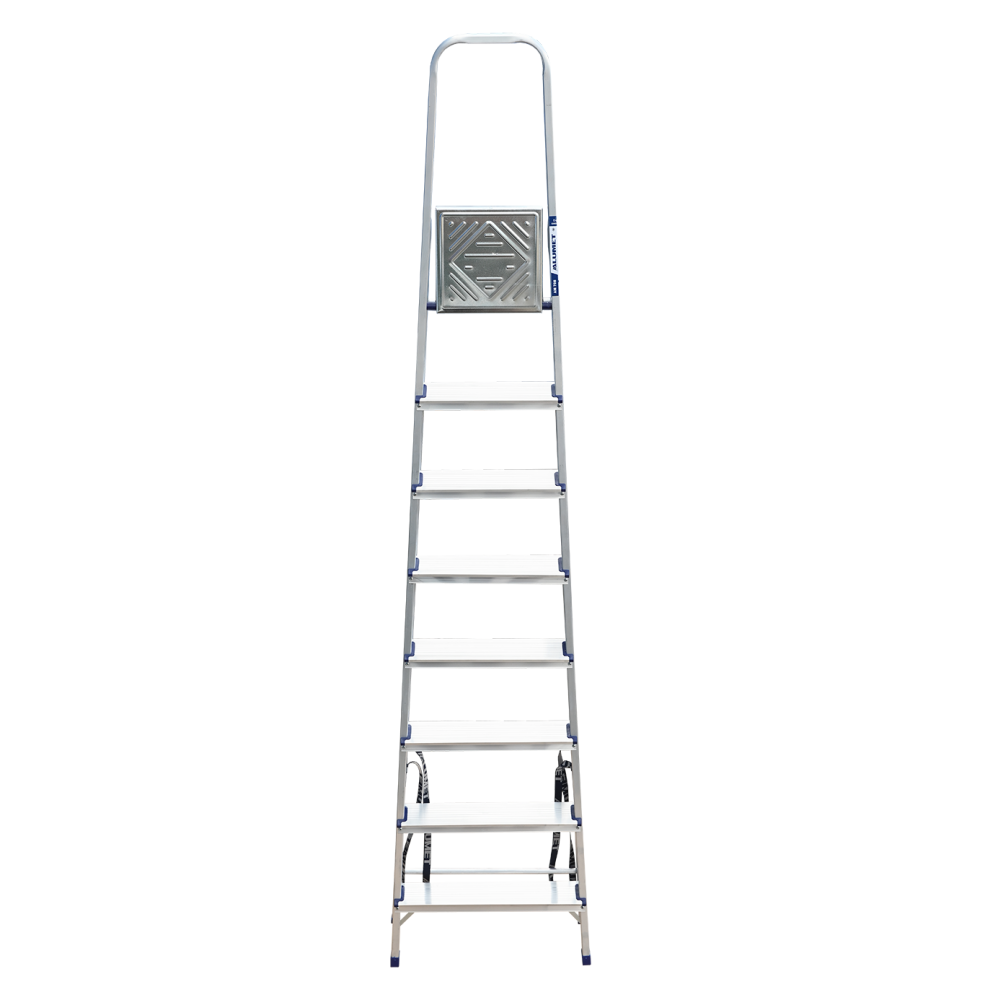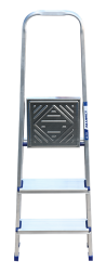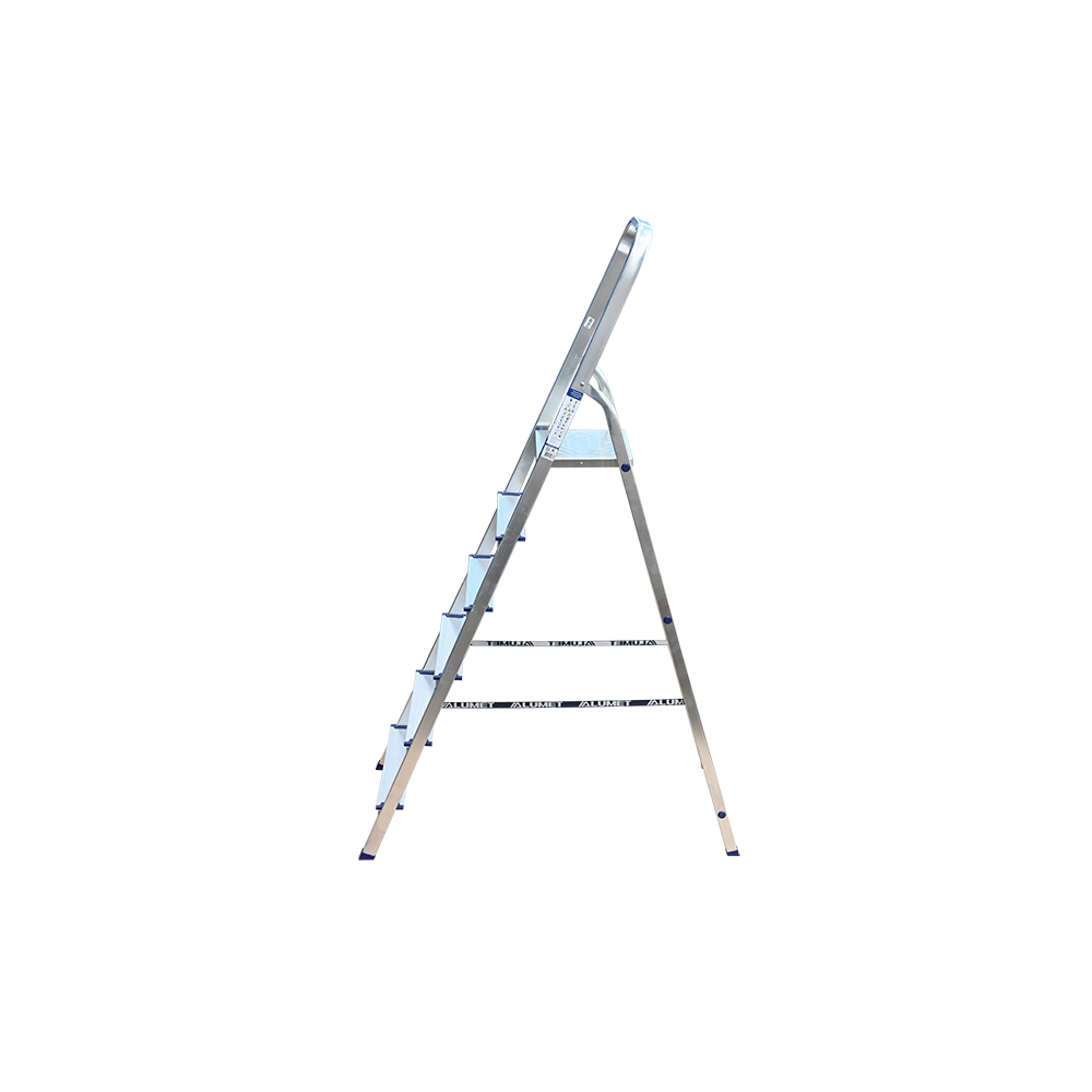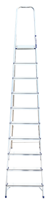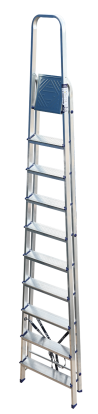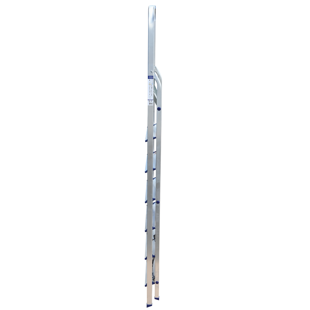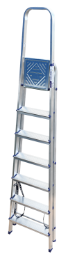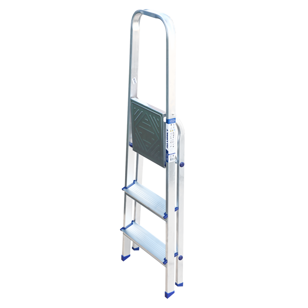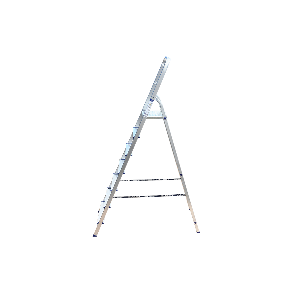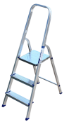 The aluminum step ladder is made of high-strength aluminum shape. The back and front legs are interconnected. The work platform is made of galvanized steel. The rungs have a serrated surface. The shoes are made of high strength plastic. The step ladder in the working position is secured by the work platform; and for step ladders with five rungs and higher – by safety ropes. The number of rungs – from 3 to 10. AM series aluminum step ladder is designed for various types of domestic and industrial work at a height of up to 4 m.