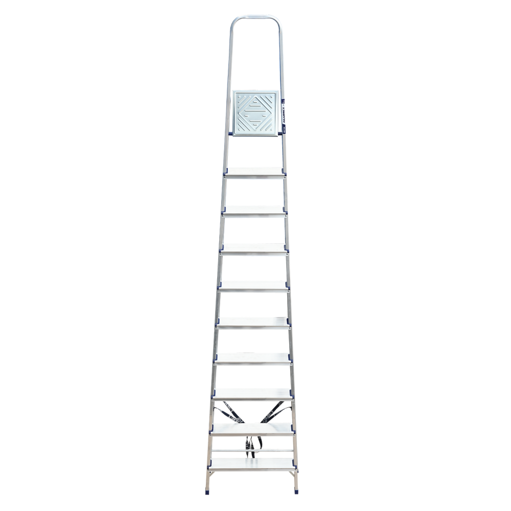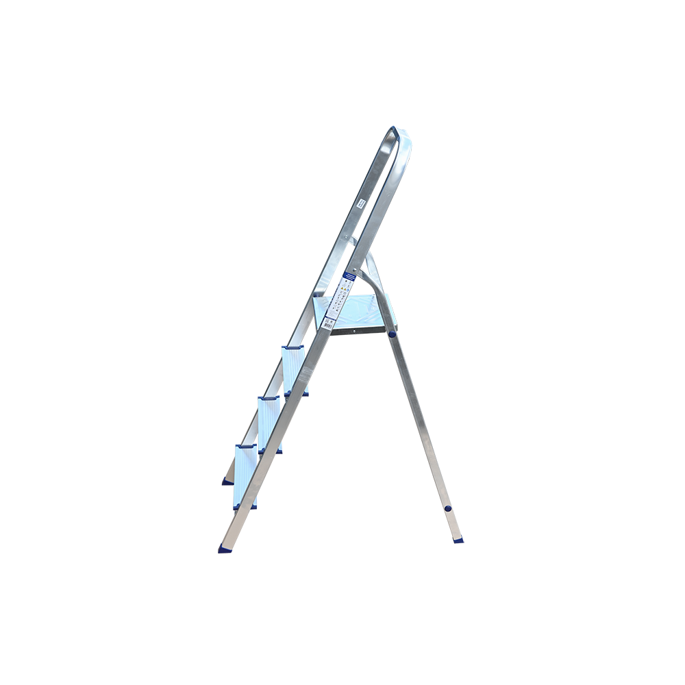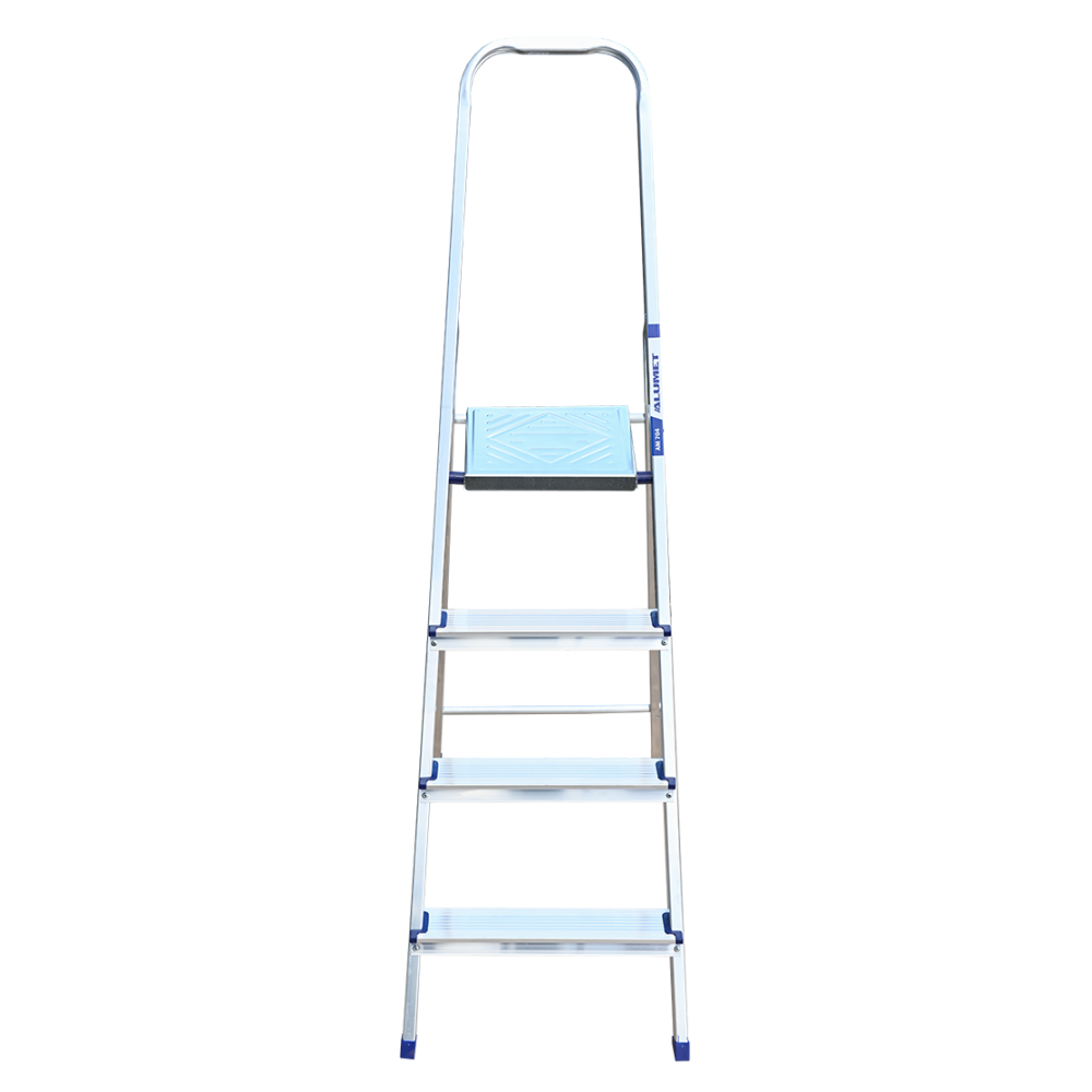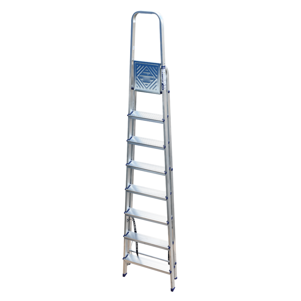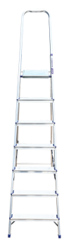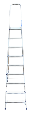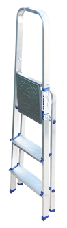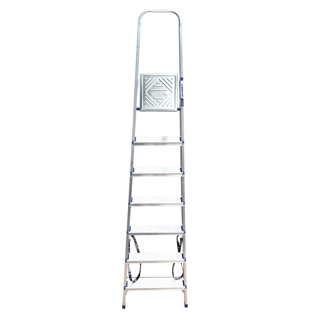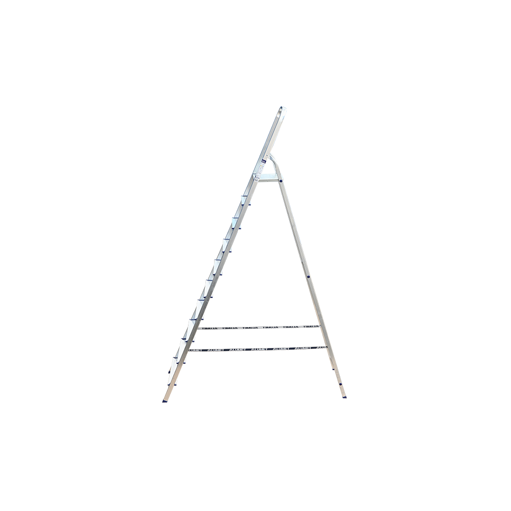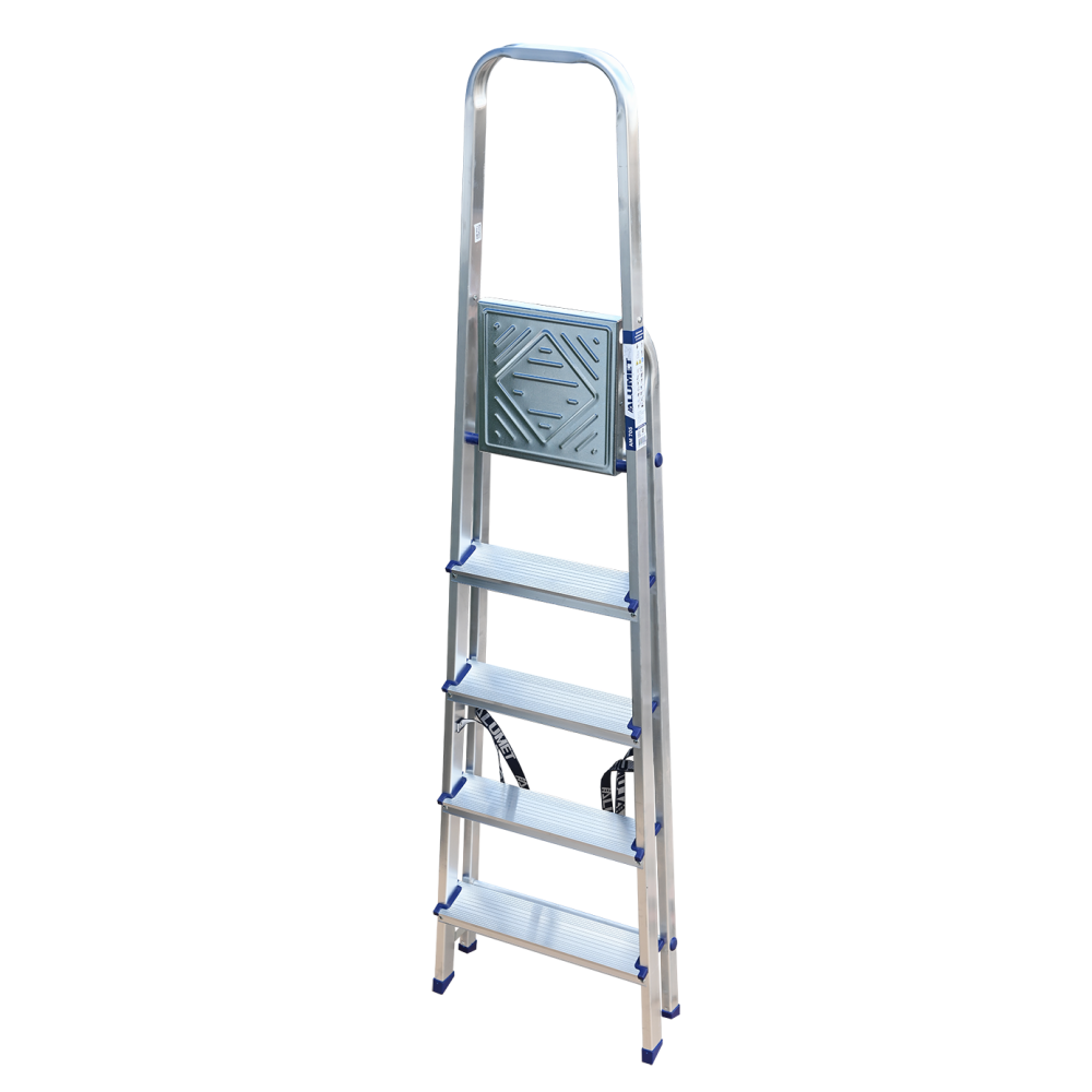 The aluminum step ladder is made of high-strength aluminum shape. The back and front legs are interconnected. The work platform is made of galvanized steel. The rungs have a serrated surface. The shoes are made of high strength plastic. The step ladder in the working position is secured by the work platform; and for step ladders with five rungs and higher – by safety ropes. The number of rungs – from 3 to 10. AM series aluminum step ladder is designed for various types of domestic and industrial work at a height of up to 4 m.