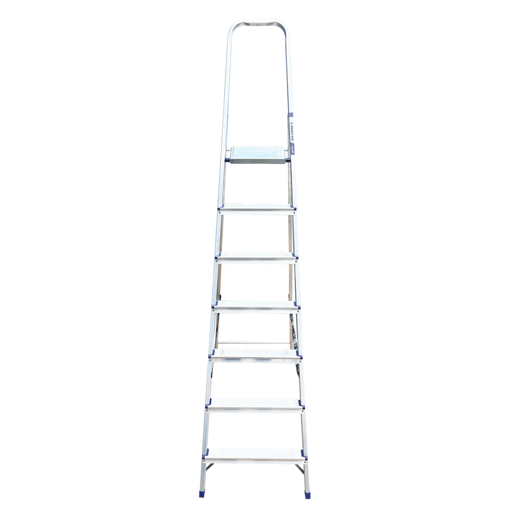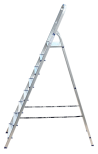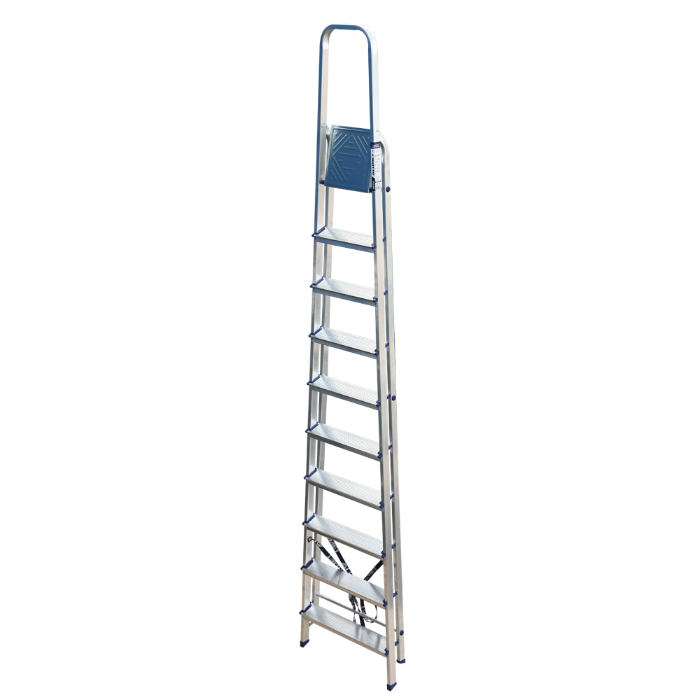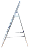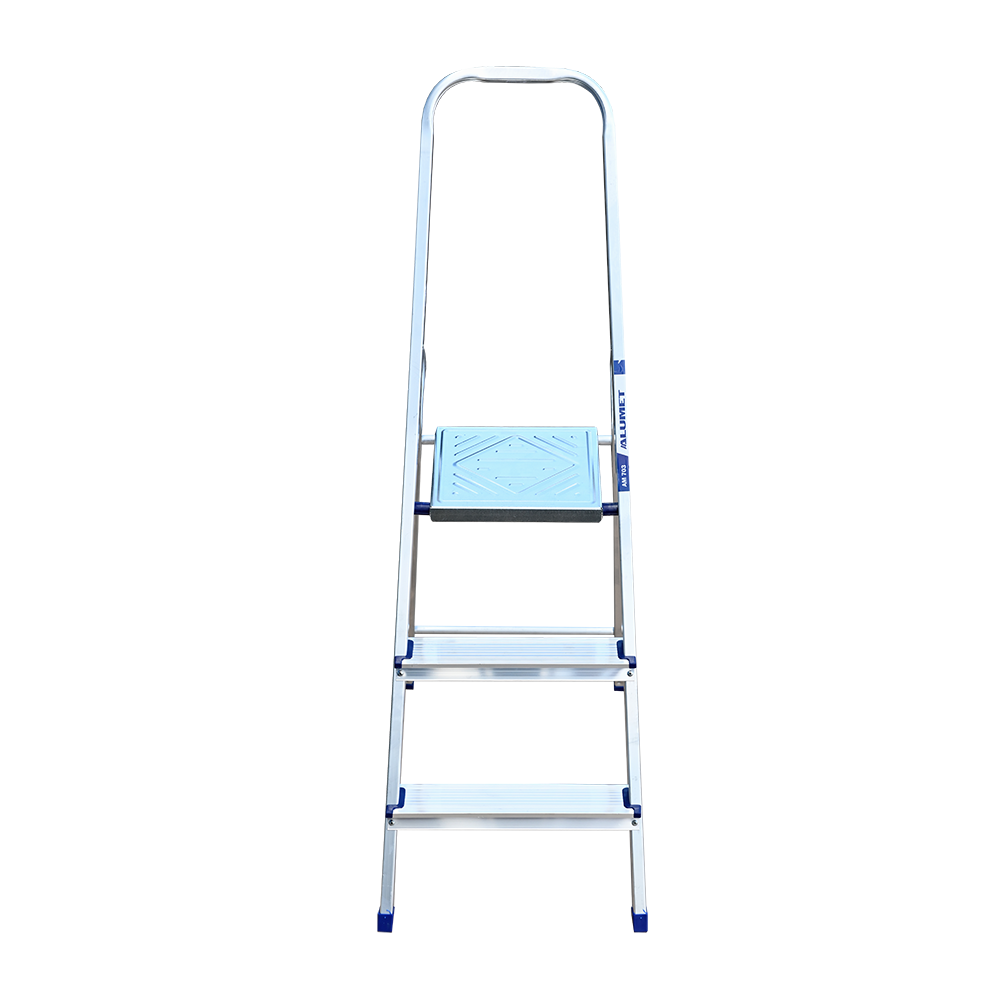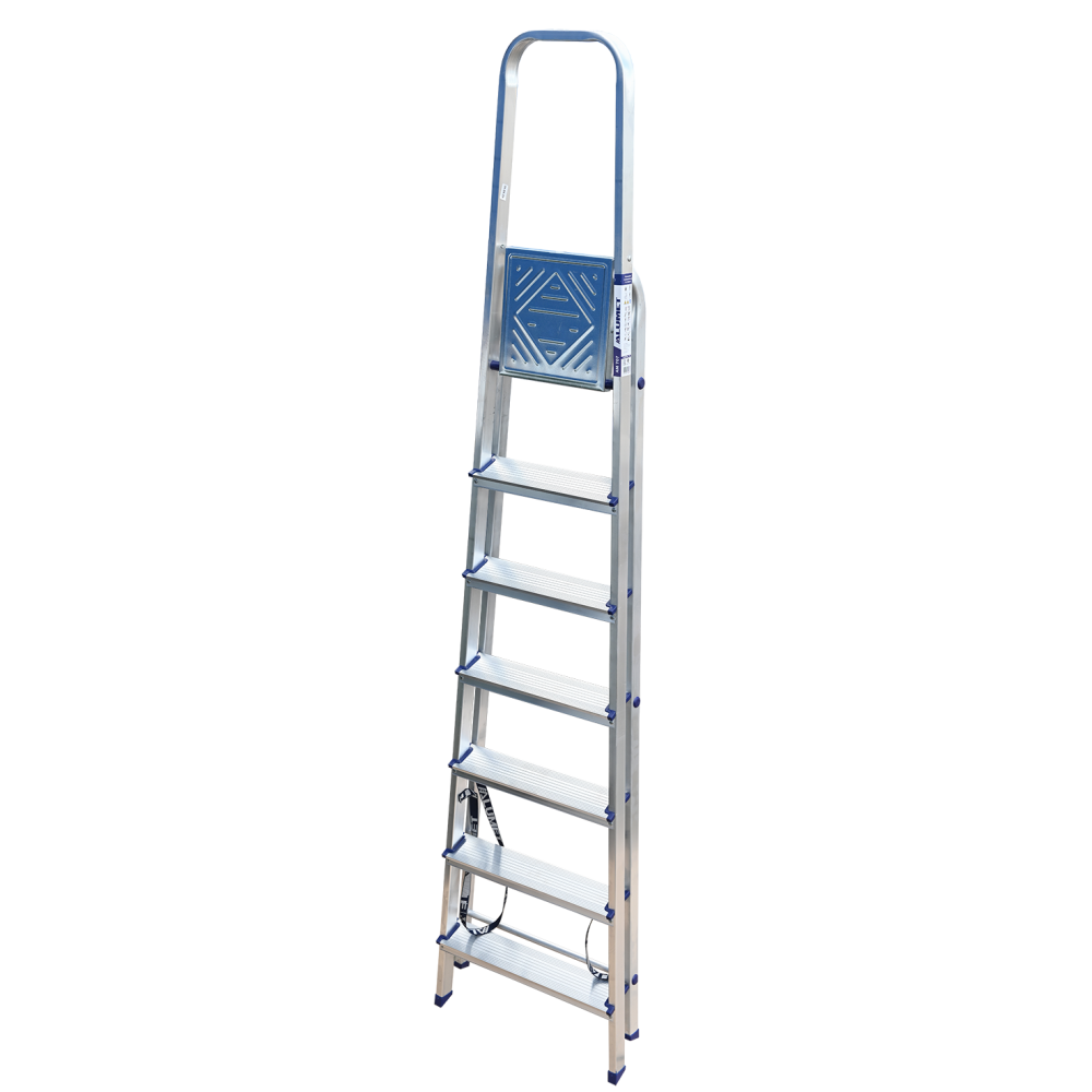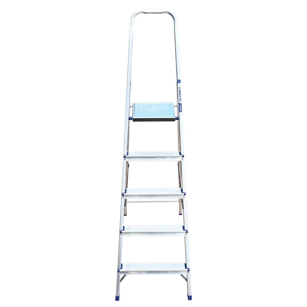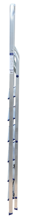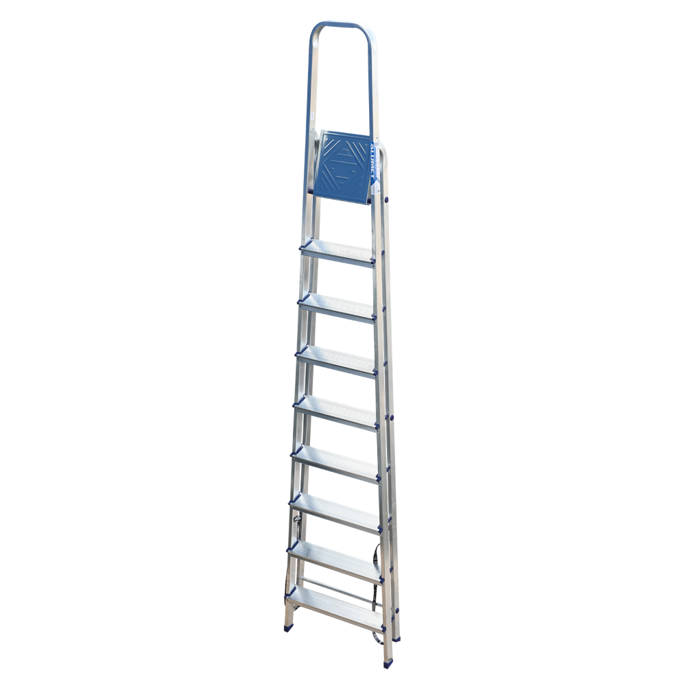 The aluminum step ladder is made of high-strength aluminum shape. The back and front legs are interconnected. The work platform is made of galvanized steel. The rungs have a serrated surface. The shoes are made of high strength plastic. The step ladder in the working position is secured by the work platform; and for step ladders with five rungs and higher – by safety ropes. The number of rungs – from 3 to 10. AM series aluminum step ladder is designed for various types of domestic and industrial work at a height of up to 4 m.
