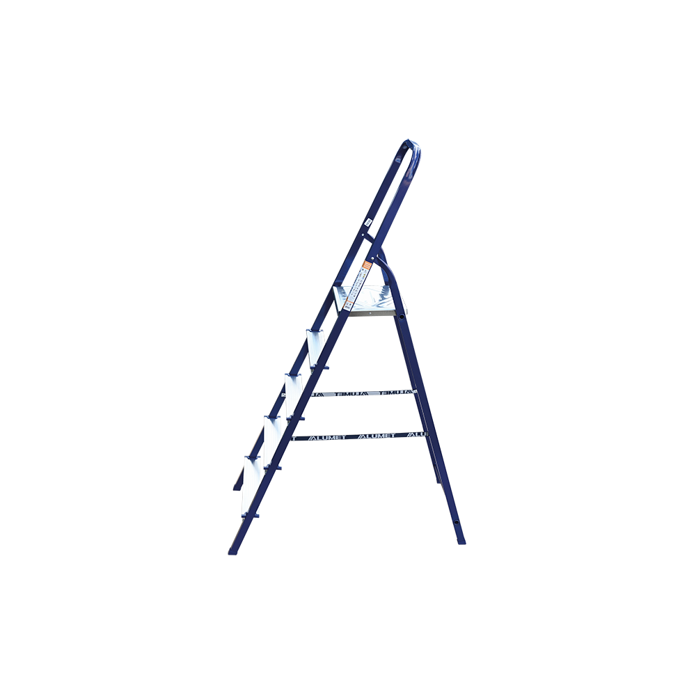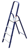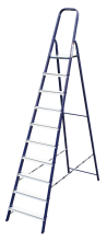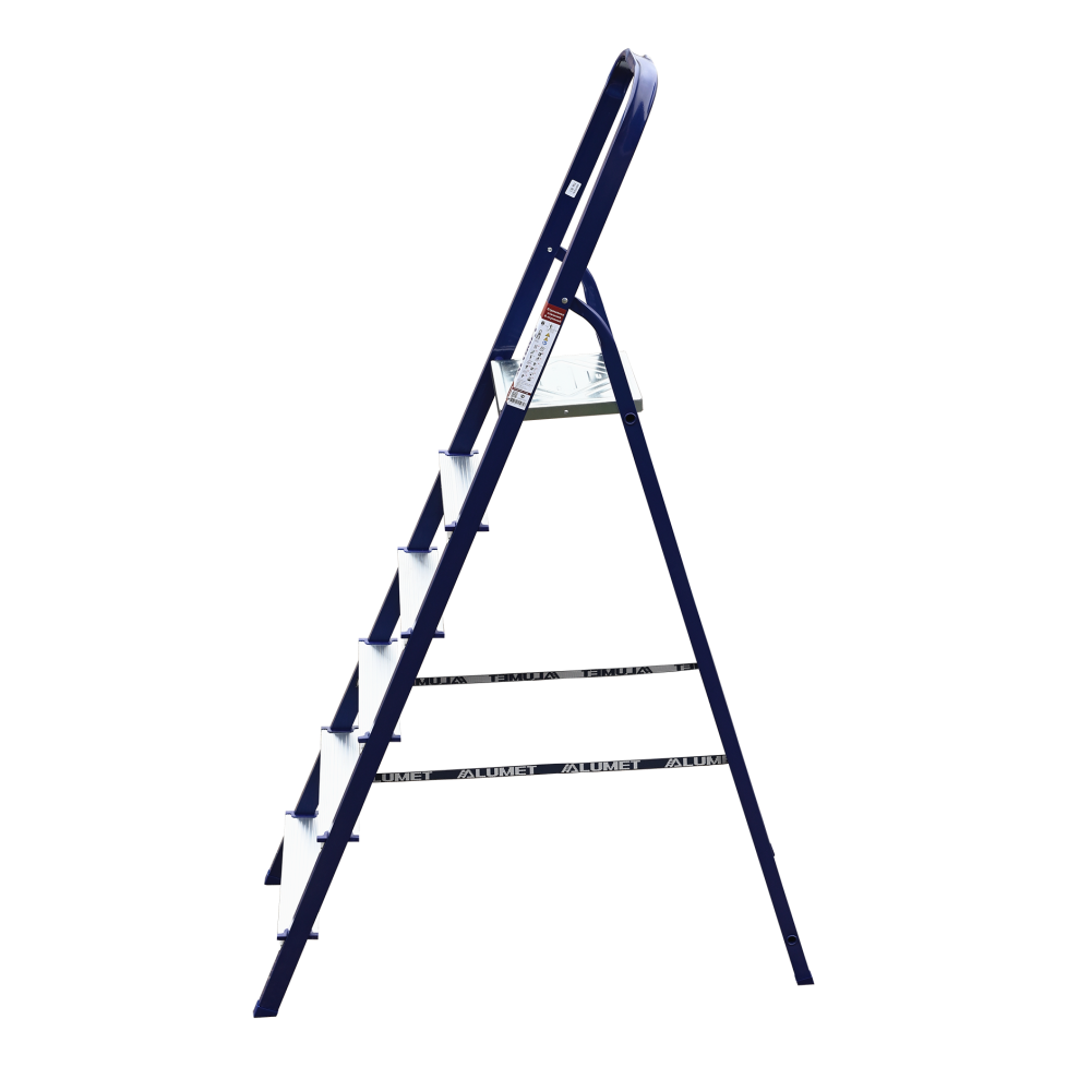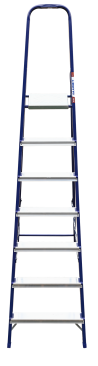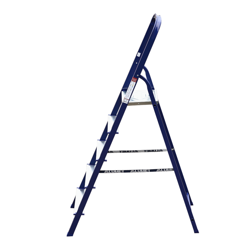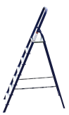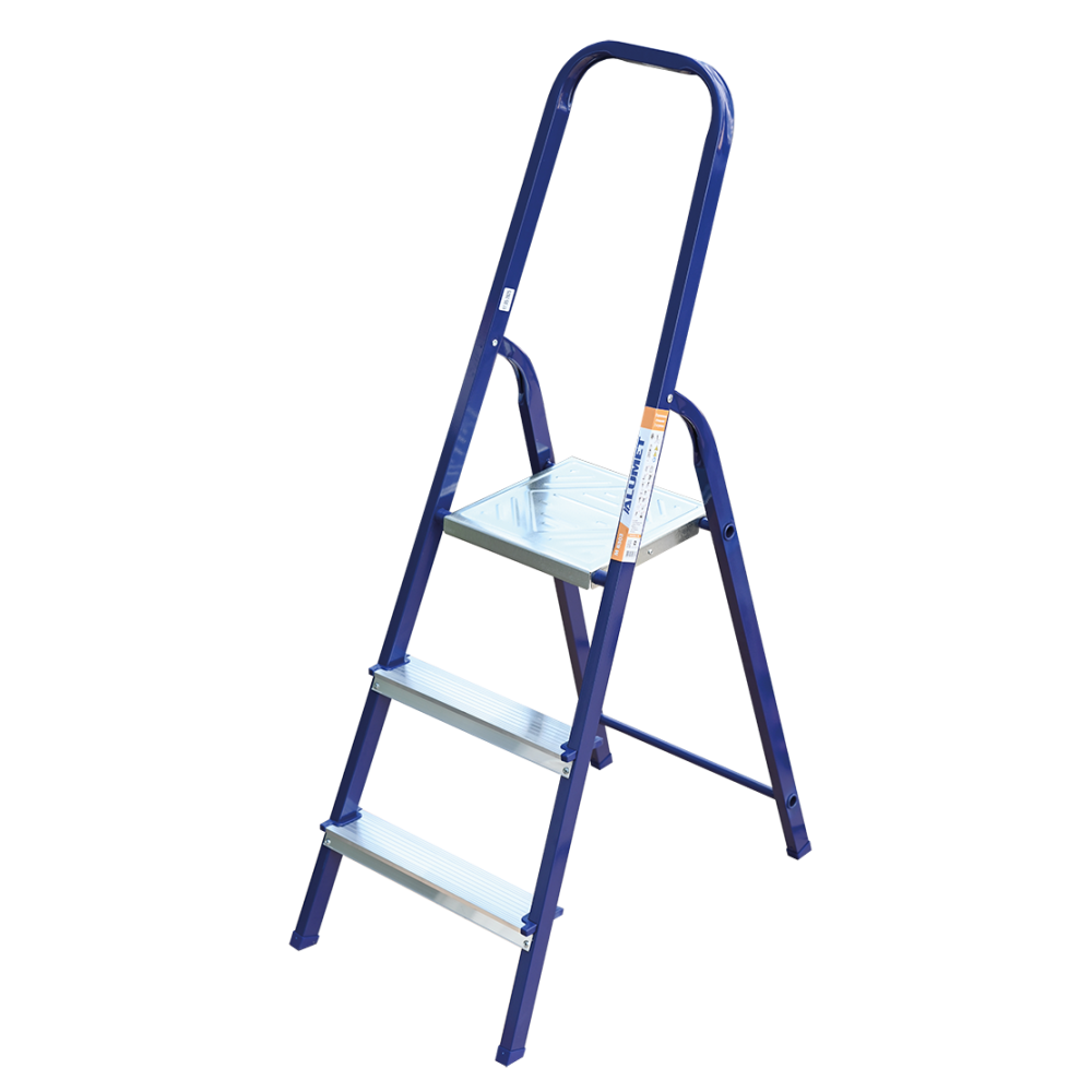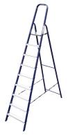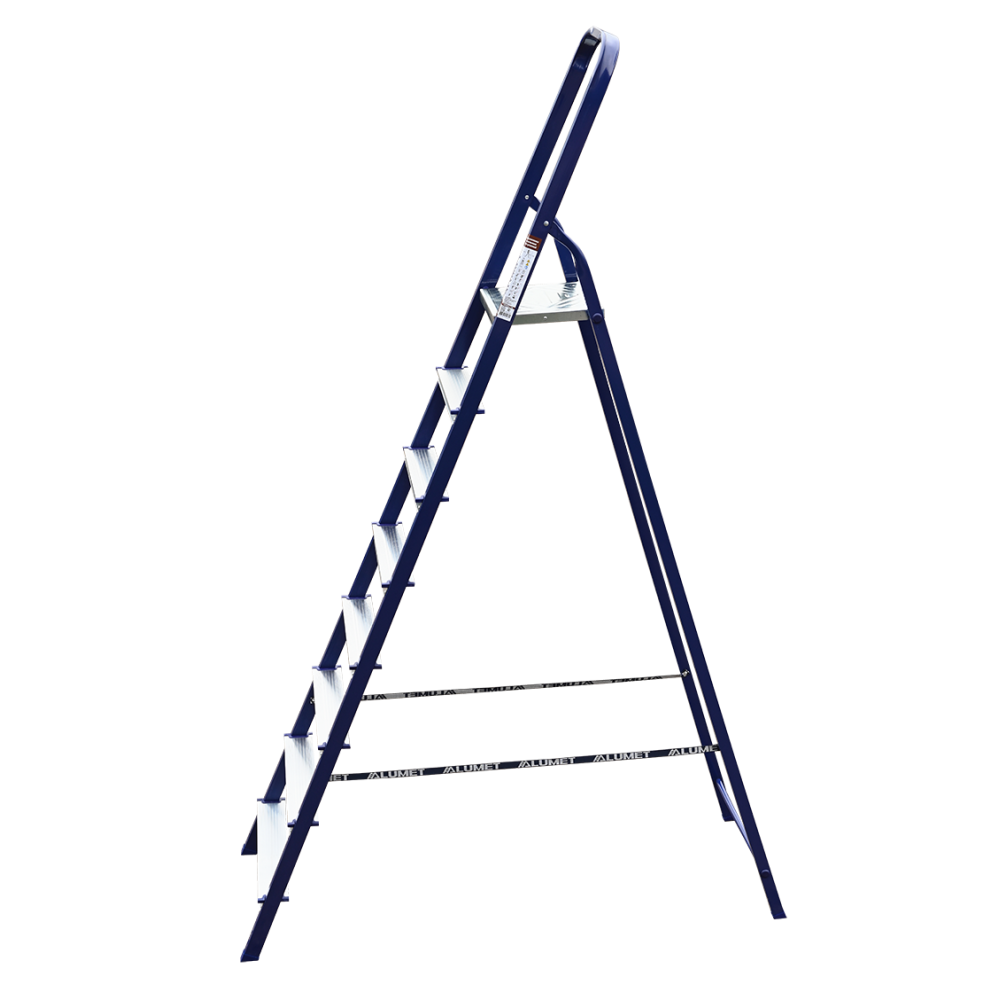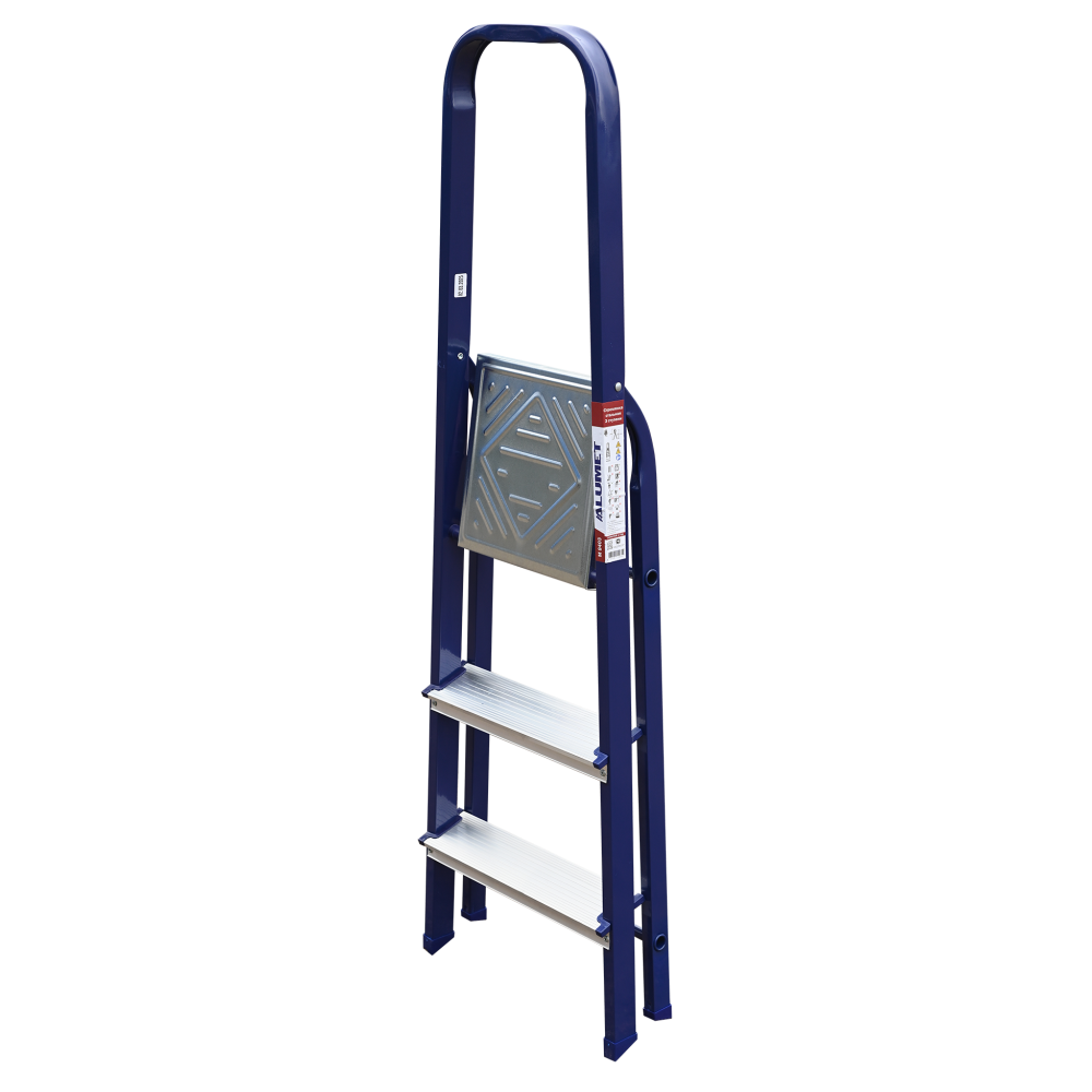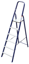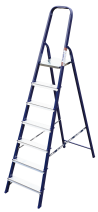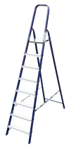 The strings of the step ladder are made of a high-strength steel shape protected against corrosion by epoxy powder enamel. The back and front legs are interconnected. The work platform is made of galvanized steel. The rungs have a serrated surface and are made of a high-strength aluminum shape. The shoes are made of high strength plastic. The step ladder in the working position is secured by the work platform; and for step ladders with five rungs and higher – by safety ropes. The number of rungs – from 3 to 10. M series aluminum step ladder is designed for various types of domestic and industrial work at a height of up to 4 m.