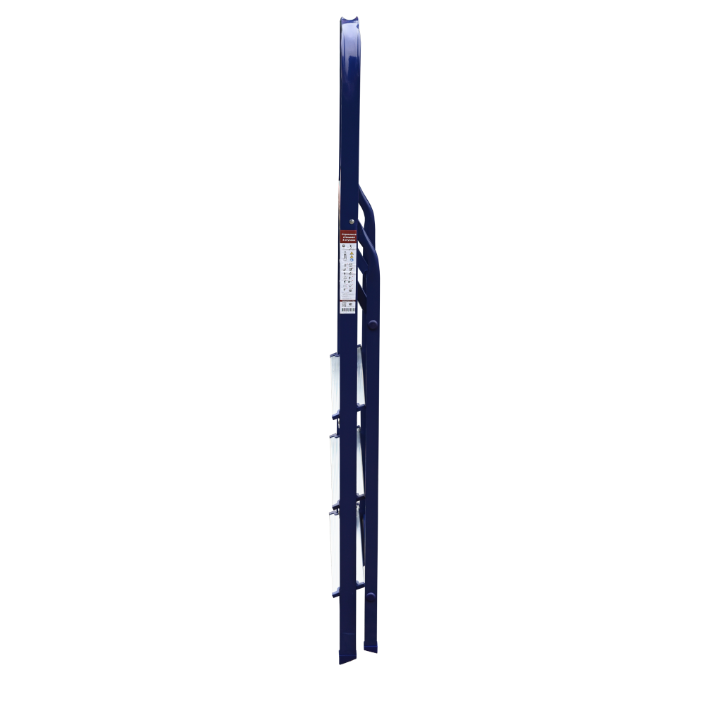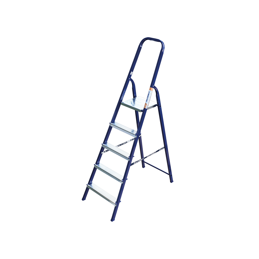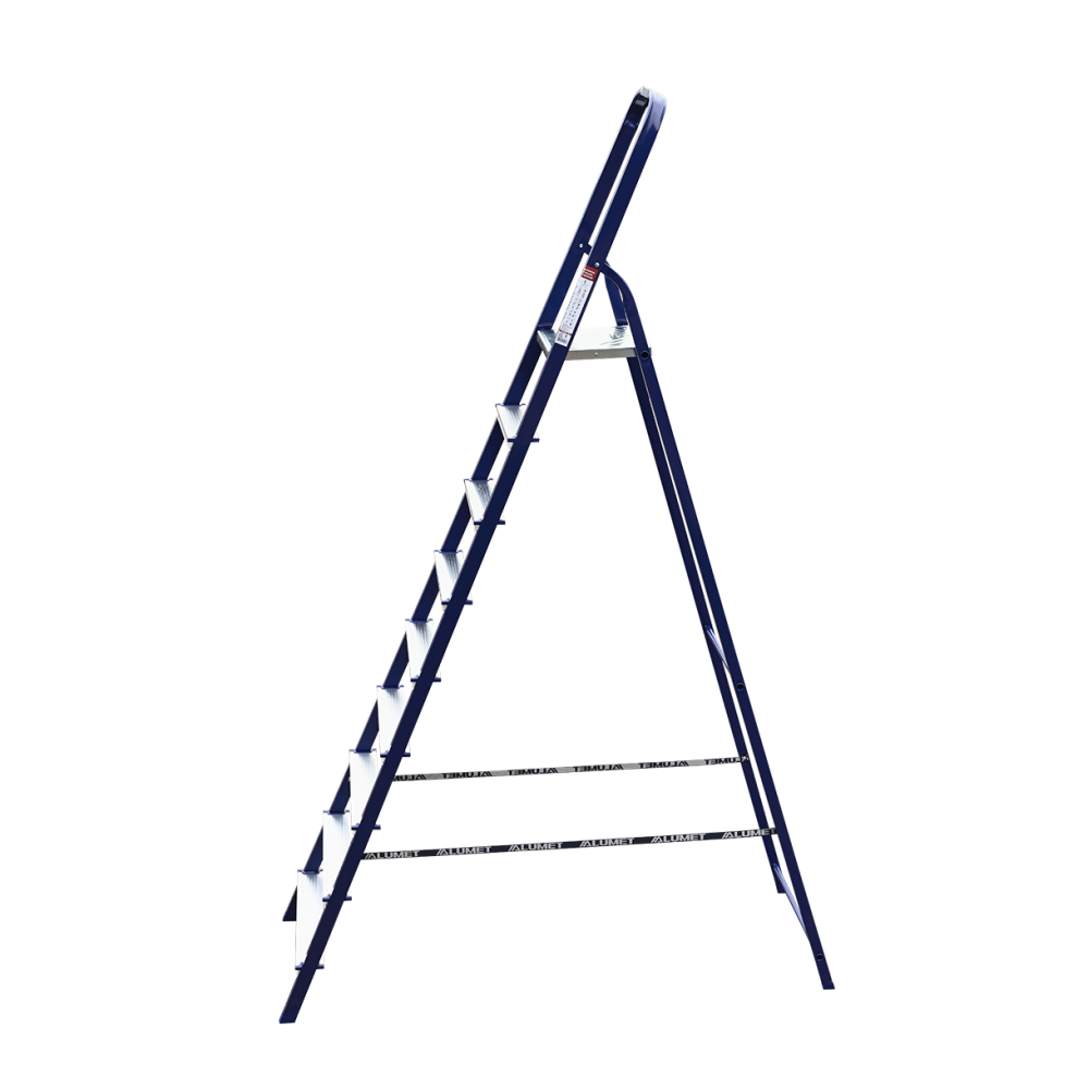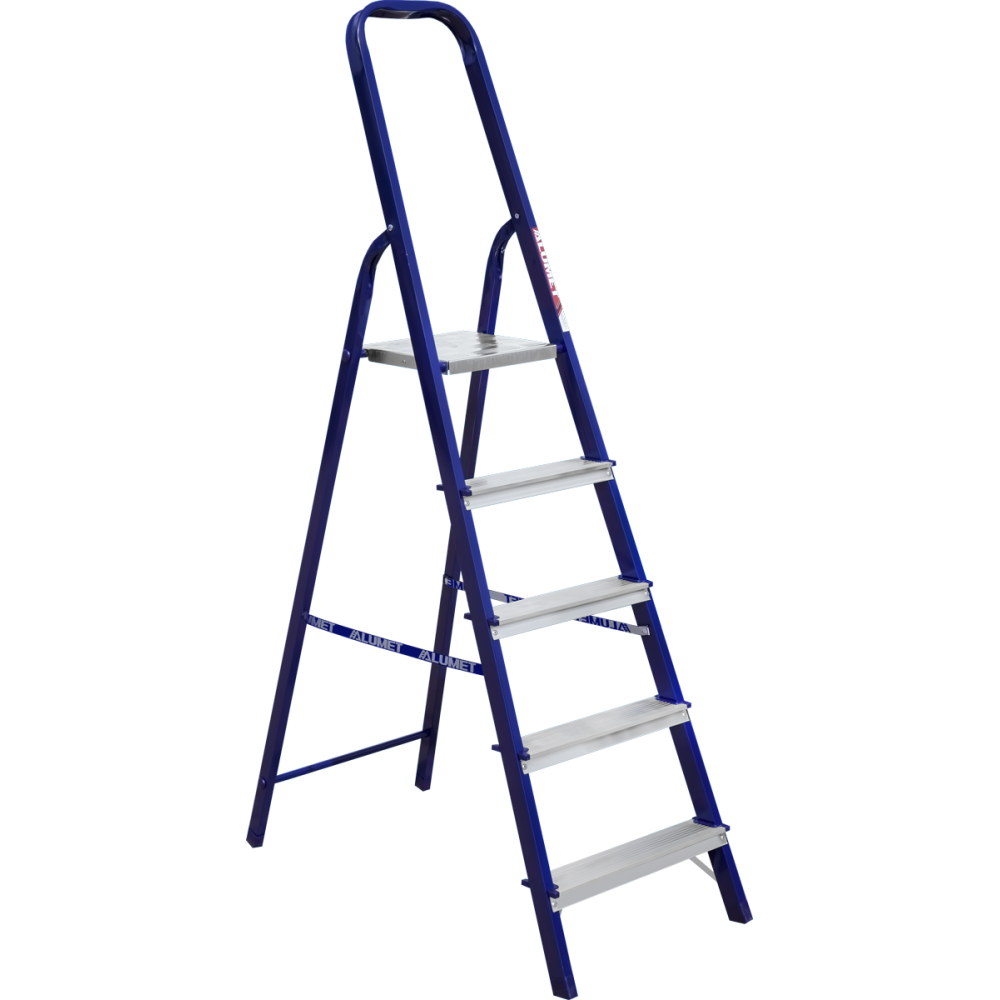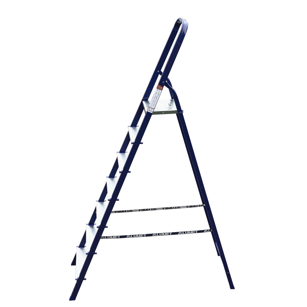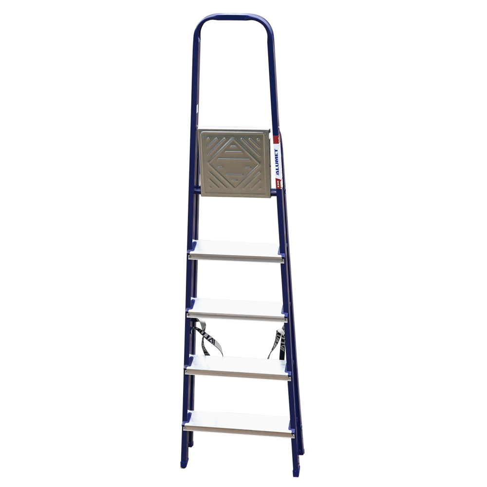 The strings of the step ladder are made of a high-strength steel shape protected against corrosion by epoxy powder enamel. The back and front legs are interconnected. The work platform is made of galvanized steel. The rungs have a serrated surface and are made of a high-strength aluminum shape. The shoes are made of high strength plastic. The step ladder in the working position is secured by the work platform; and for step ladders with five rungs and higher – by safety ropes. The number of rungs – from 3 to 10. M series aluminum step ladder is designed for various types of domestic and industrial work at a height of up to 4 m.