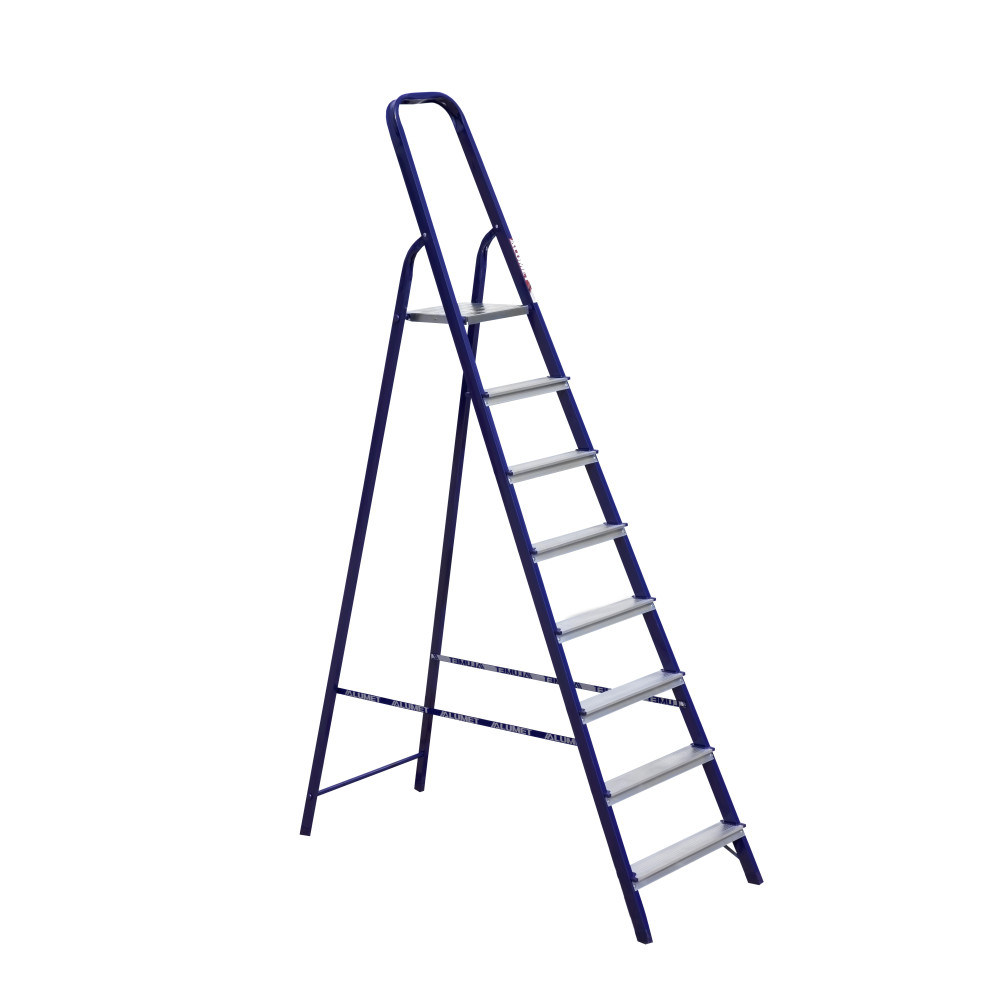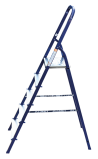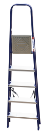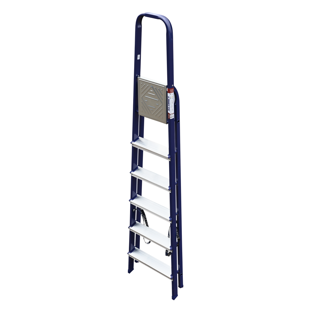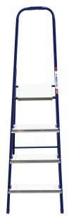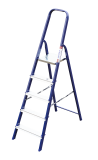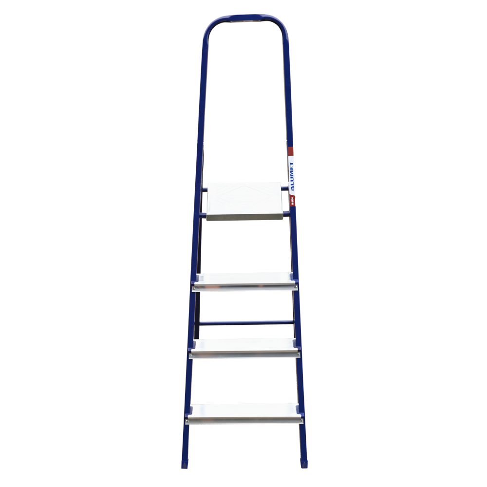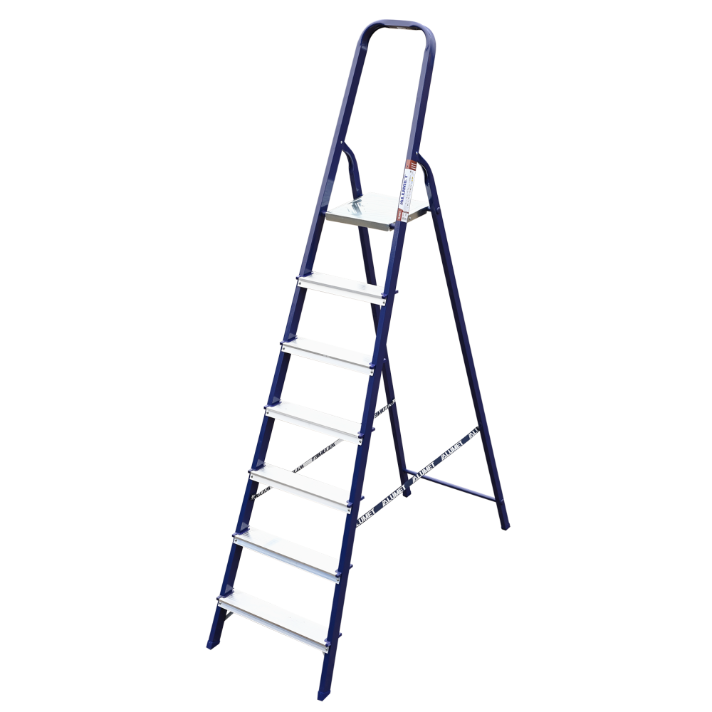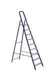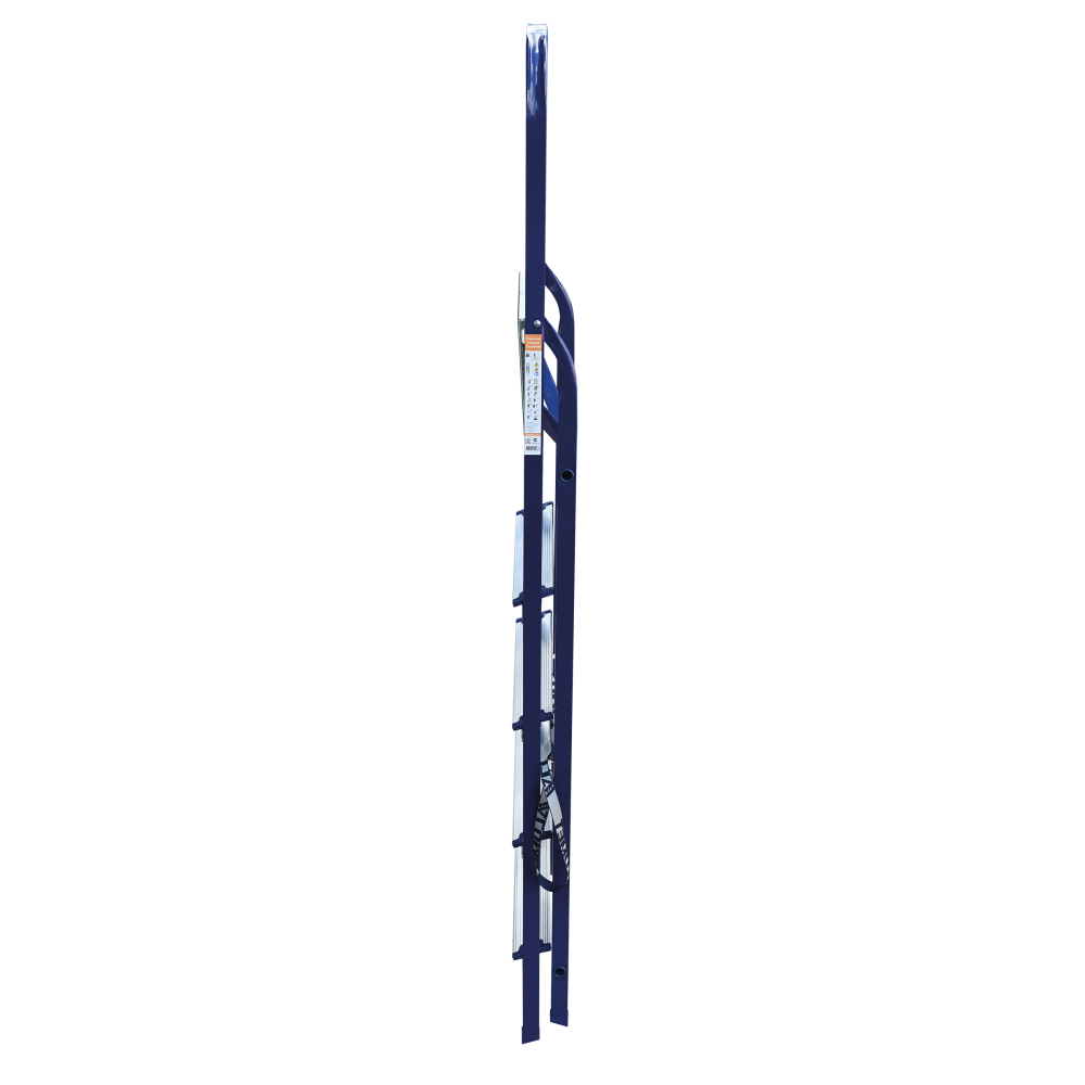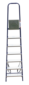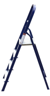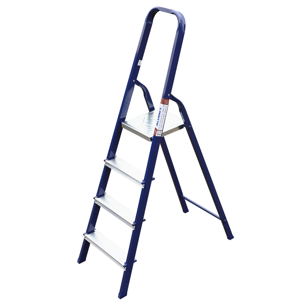 The strings of the step ladder are made of a high-strength steel shape protected against corrosion by epoxy powder enamel. The back and front legs are interconnected. The work platform is made of galvanized steel. The rungs have a serrated surface and are made of a high-strength aluminum shape. The shoes are made of high strength plastic. The step ladder in the working position is secured by the work platform; and for step ladders with five rungs and higher – by safety ropes. The number of rungs – from 3 to 10. M series aluminum step ladder is designed for various types of domestic and industrial work at a height of up to 4 m.