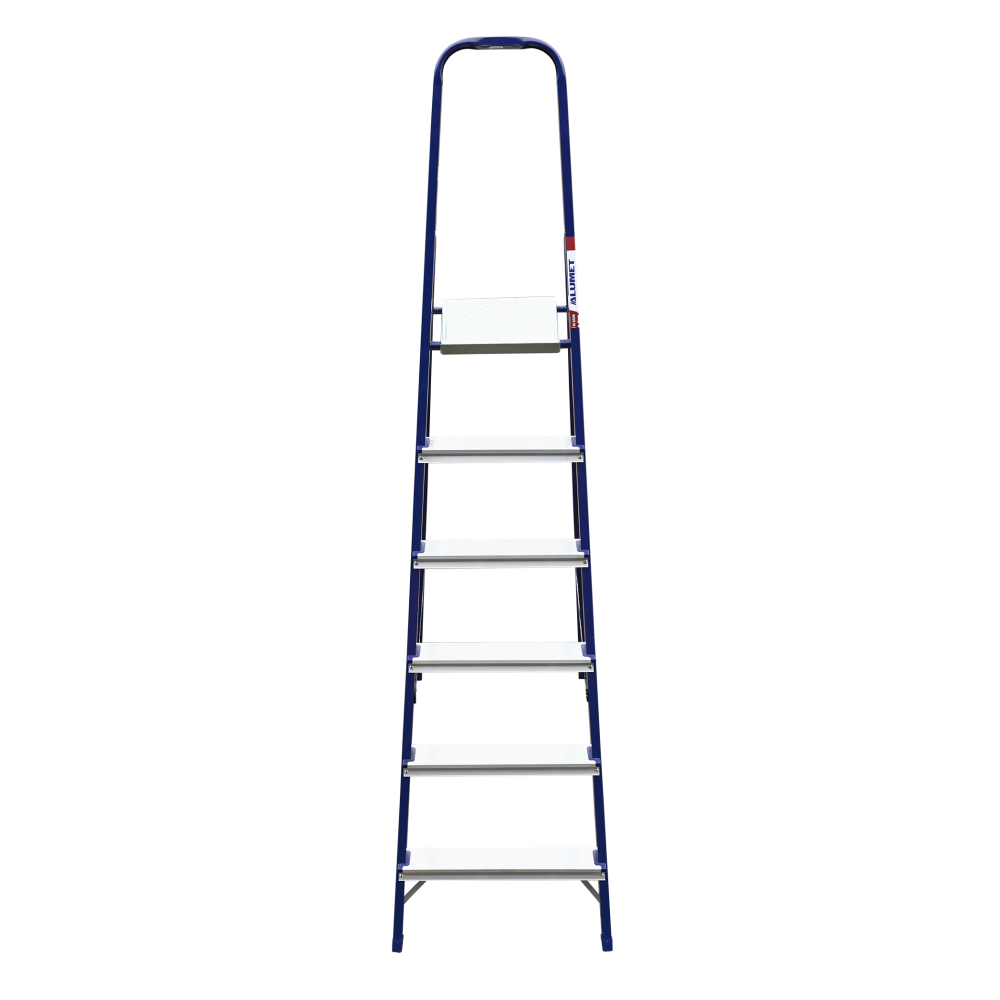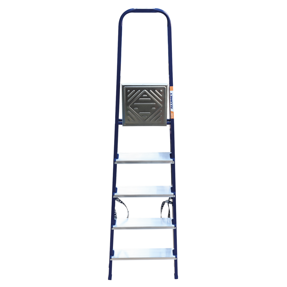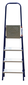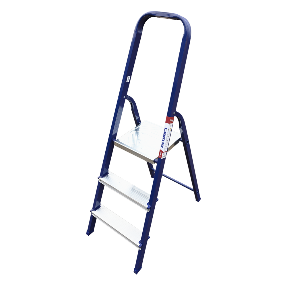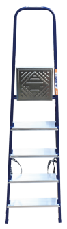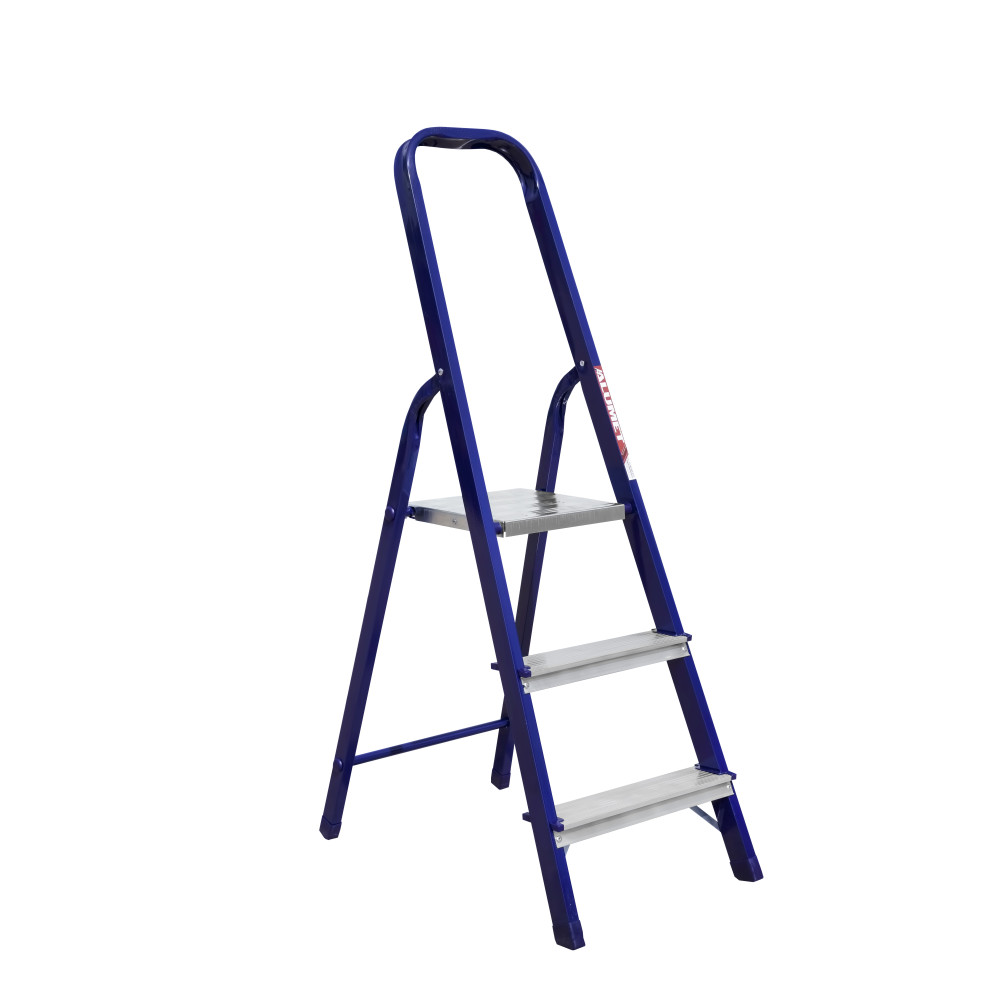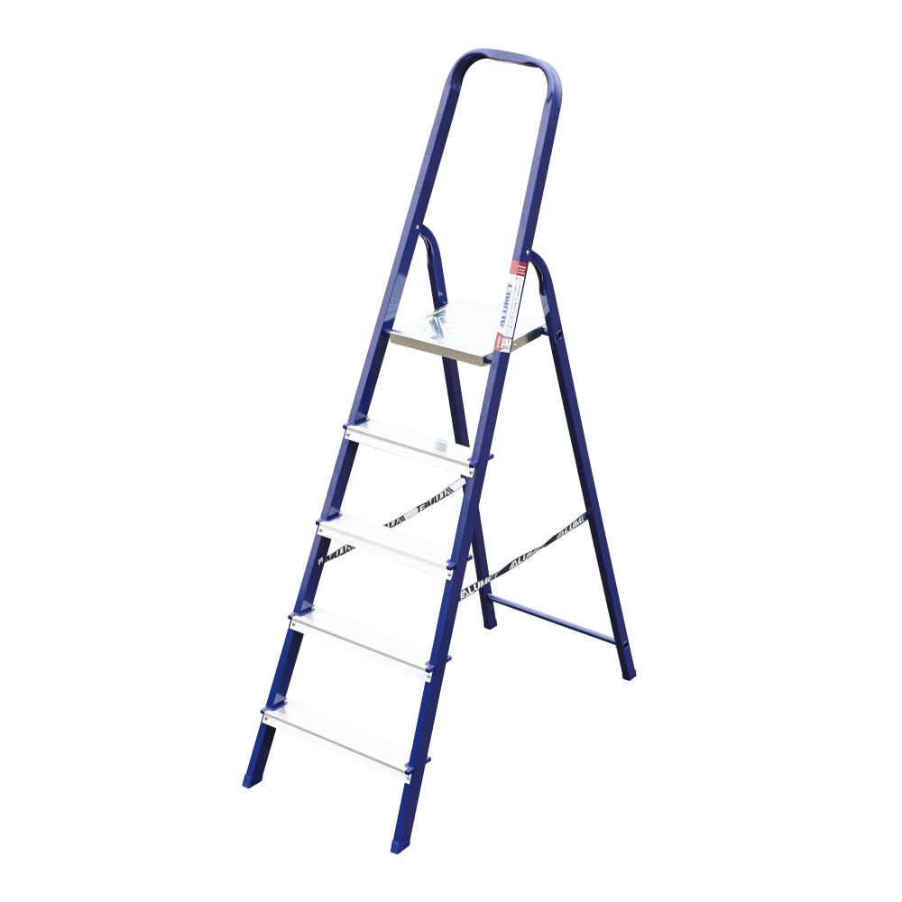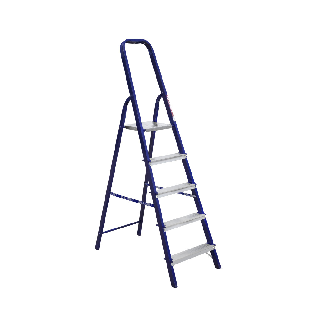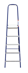 The strings of the step ladder are made of a high-strength steel shape protected against corrosion by epoxy powder enamel. The back and front legs are interconnected. The work platform is made of galvanized steel. The rungs have a serrated surface and are made of a high-strength aluminum shape. The shoes are made of high strength plastic. The step ladder in the working position is secured by the work platform; and for step ladders with five rungs and higher – by safety ropes. The number of rungs – from 3 to 10. M series aluminum step ladder is designed for various types of domestic and industrial work at a height of up to 4 m.