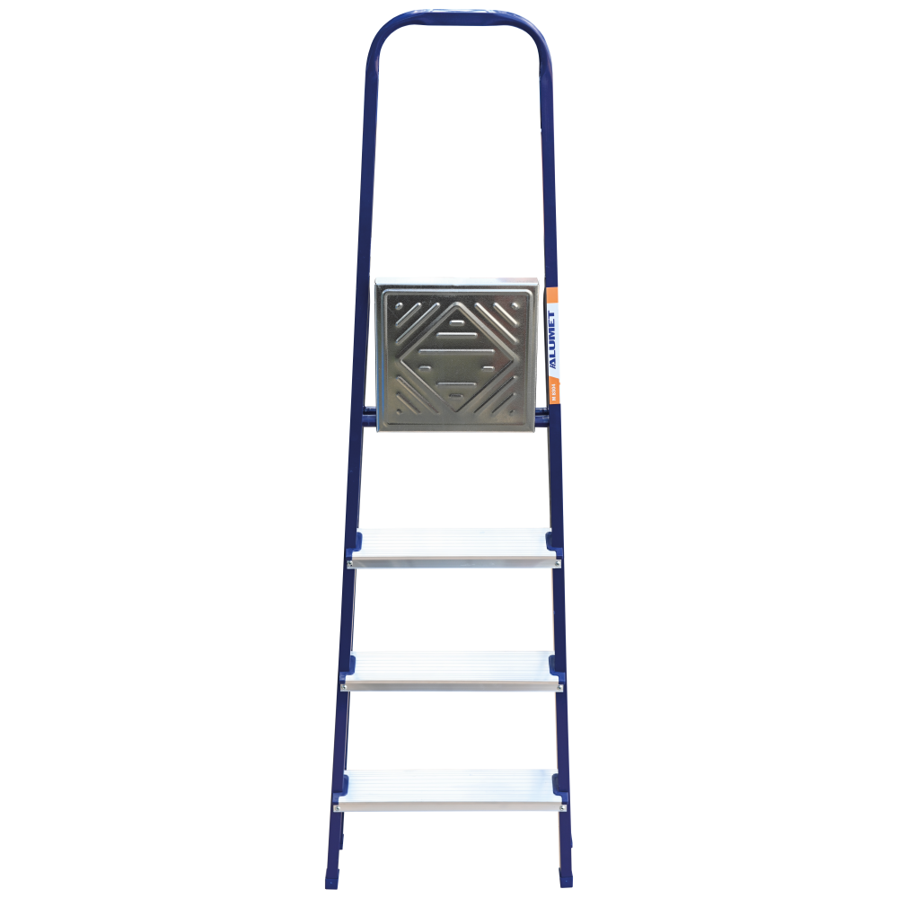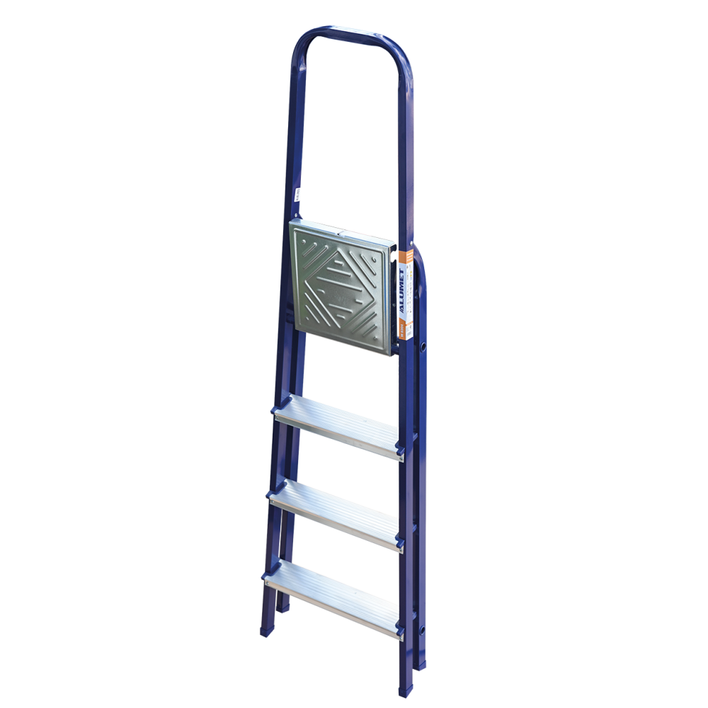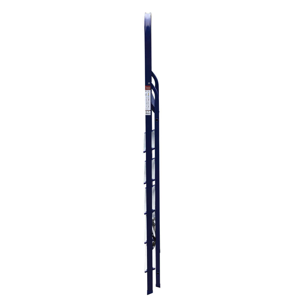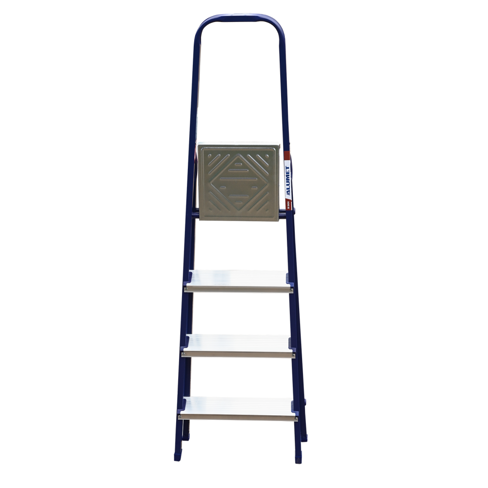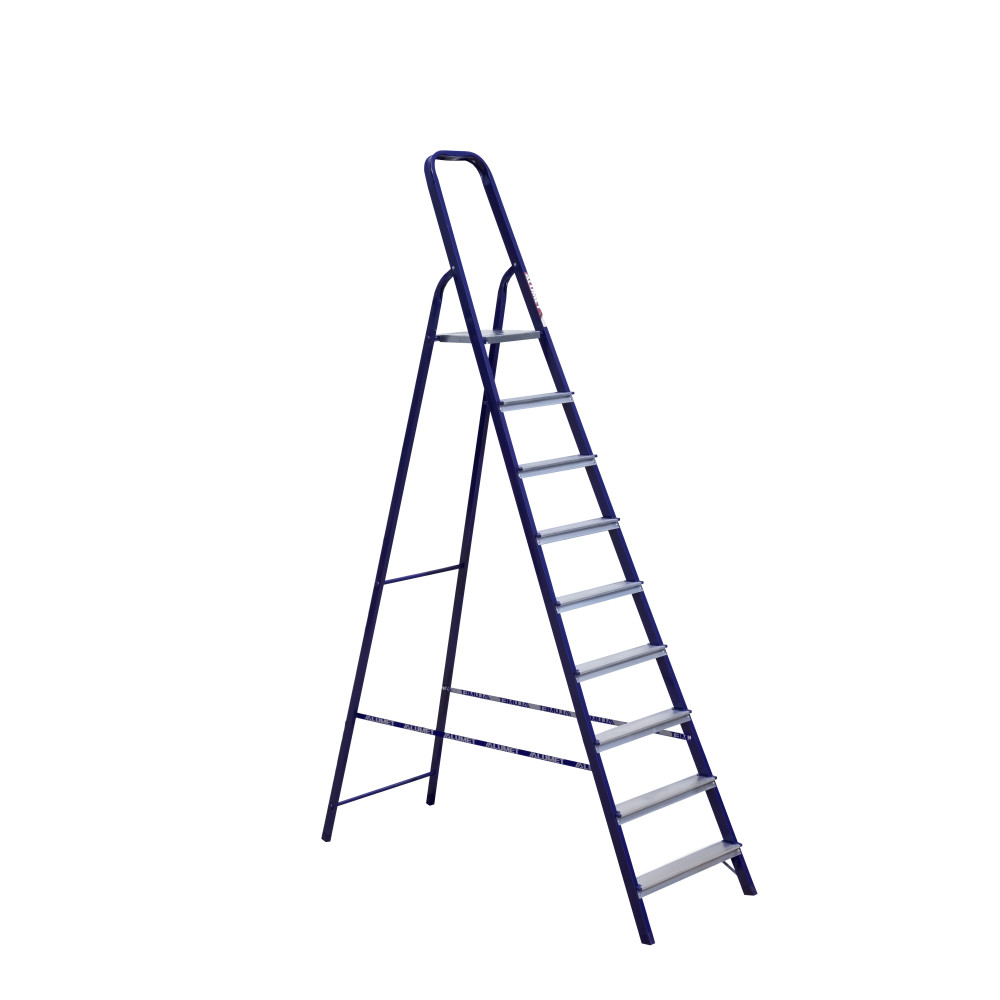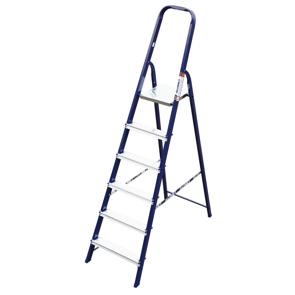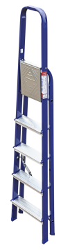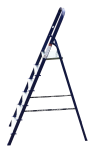 The strings of the step ladder are made of a high-strength steel shape protected against corrosion by epoxy powder enamel. The back and front legs are interconnected. The work platform is made of galvanized steel. The rungs have a serrated surface and are made of a high-strength aluminum shape. The shoes are made of high strength plastic. The step ladder in the working position is secured by the work platform; and for step ladders with five rungs and higher – by safety ropes. The number of rungs – from 3 to 10. M series aluminum step ladder is designed for various types of domestic and industrial work at a height of up to 4 m.