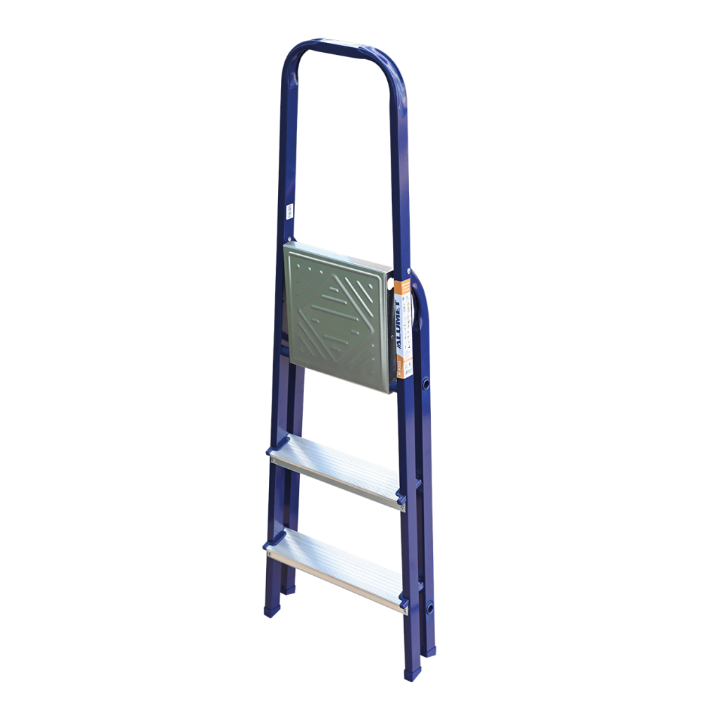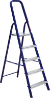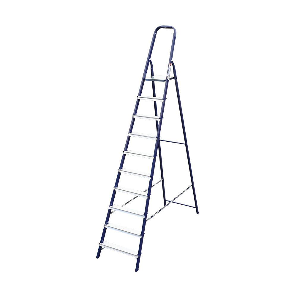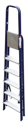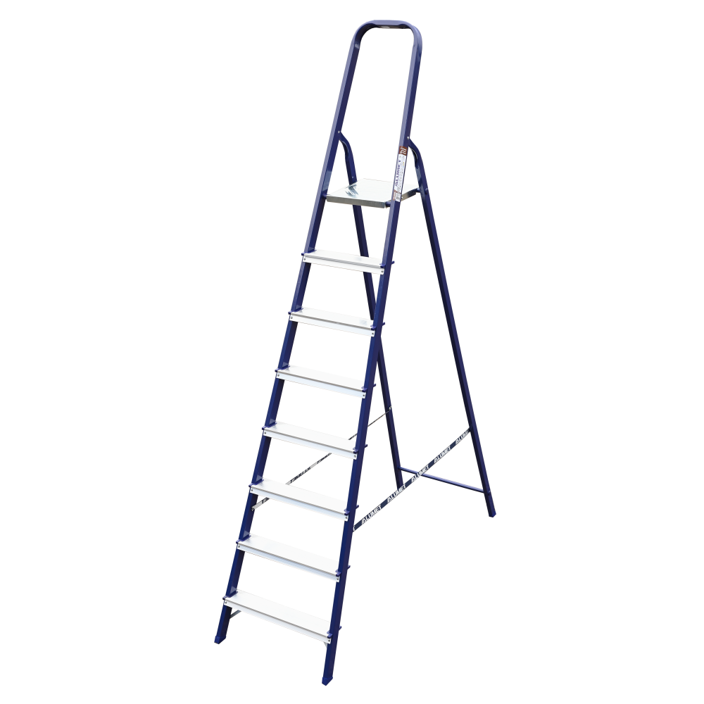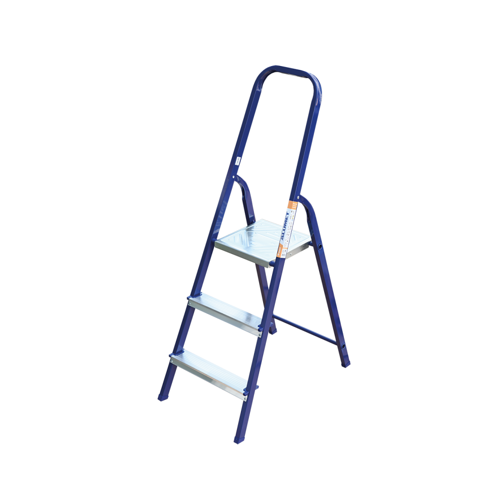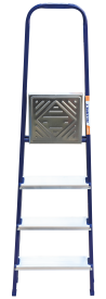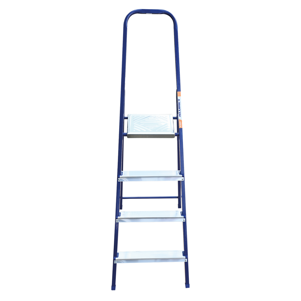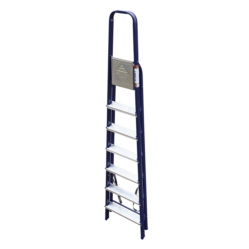 The strings of the step ladder are made of a high-strength steel shape protected against corrosion by epoxy powder enamel. The back and front legs are interconnected. The work platform is made of galvanized steel. The rungs have a serrated surface and are made of a high-strength aluminum shape. The shoes are made of high strength plastic. The step ladder in the working position is secured by the work platform; and for step ladders with five rungs and higher – by safety ropes. The number of rungs – from 3 to 10. M series aluminum step ladder is designed for various types of domestic and industrial work at a height of up to 4 m.
