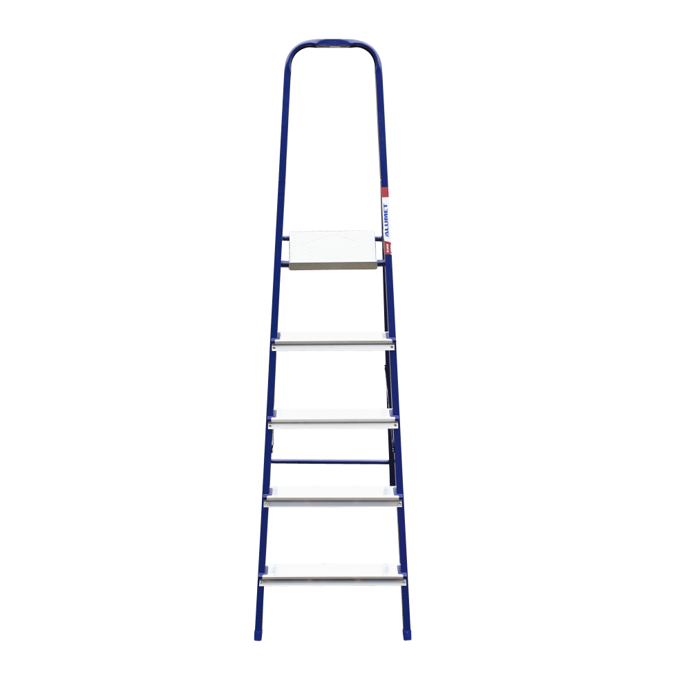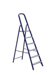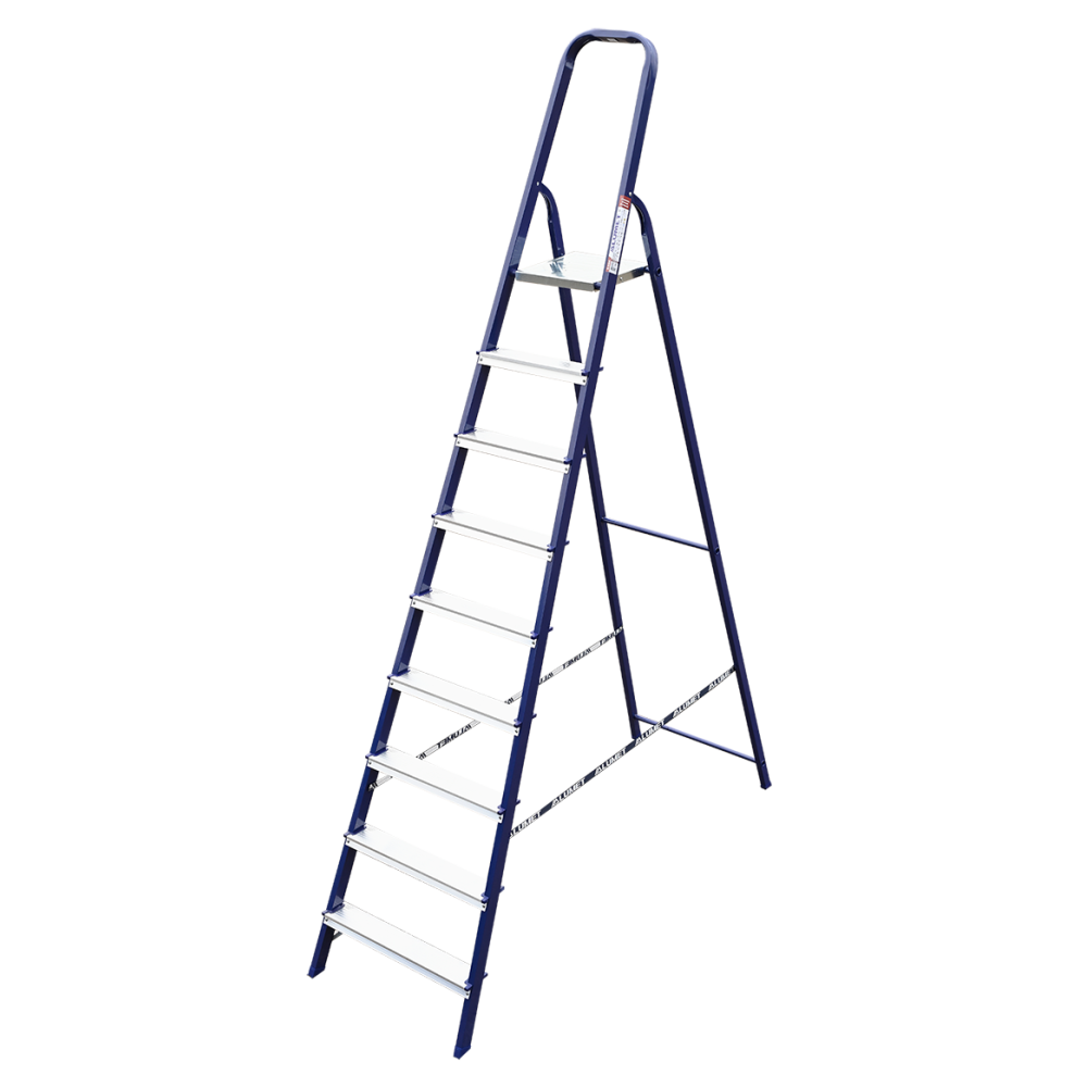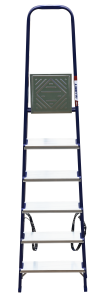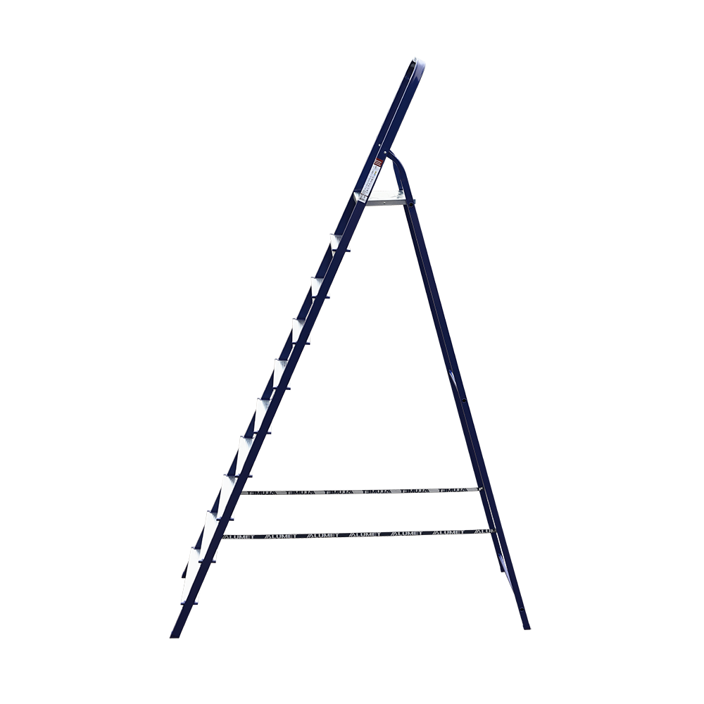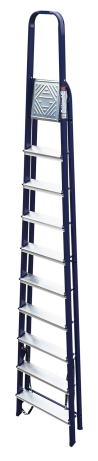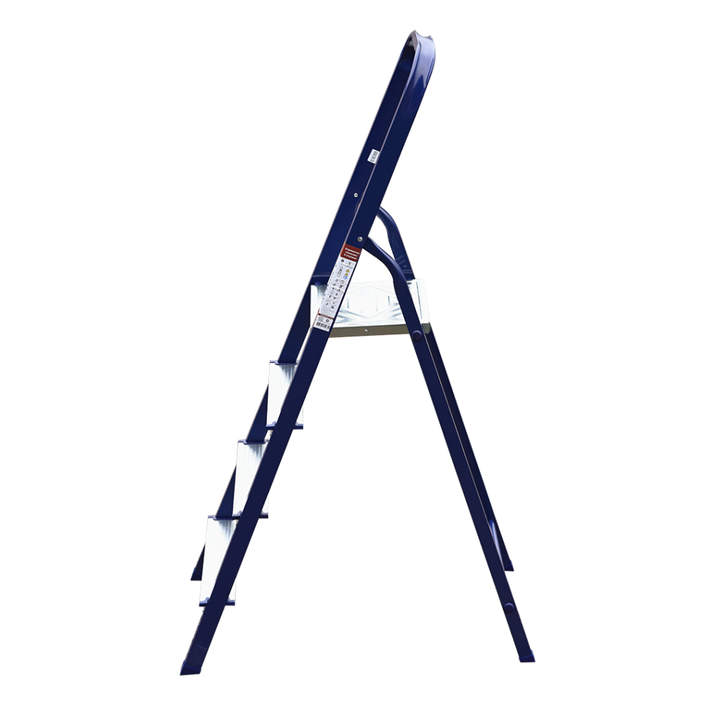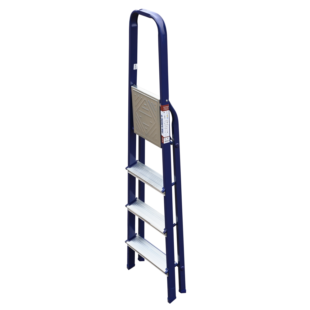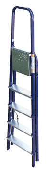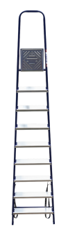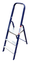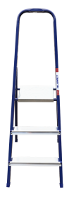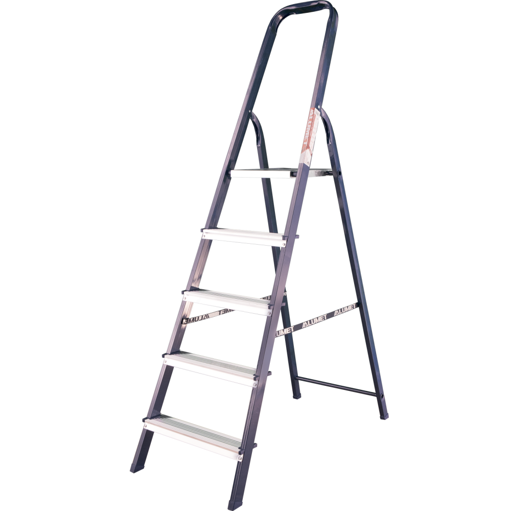 The strings of the step ladder are made of a high-strength steel shape protected against corrosion by epoxy powder enamel. The back and front legs are interconnected. The work platform is made of galvanized steel. The rungs have a serrated surface and are made of a high-strength aluminum shape. The shoes are made of high strength plastic. The step ladder in the working position is secured by the work platform; and for step ladders with five rungs and higher – by safety ropes. The number of rungs – from 3 to 10. M series aluminum step ladder is designed for various types of domestic and industrial work at a height of up to 4 m.