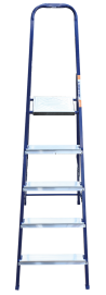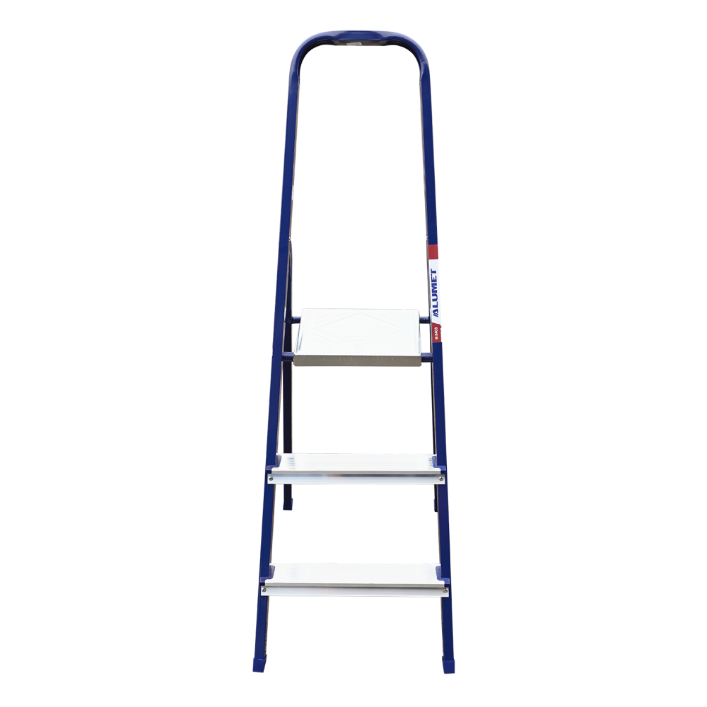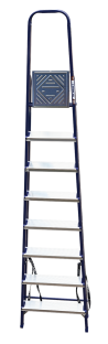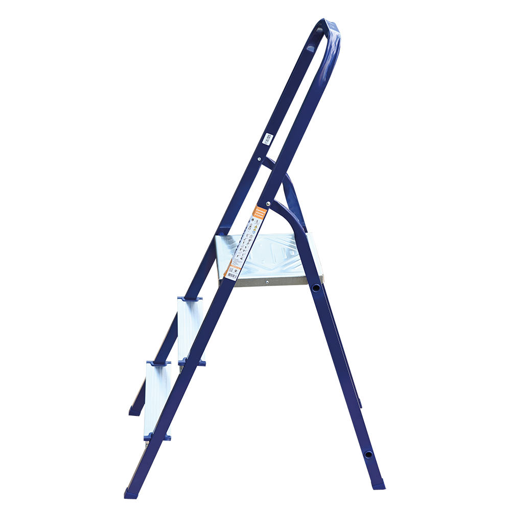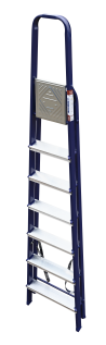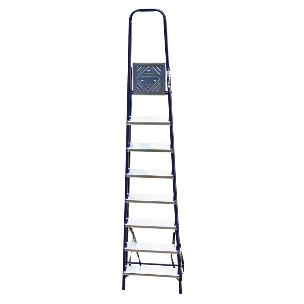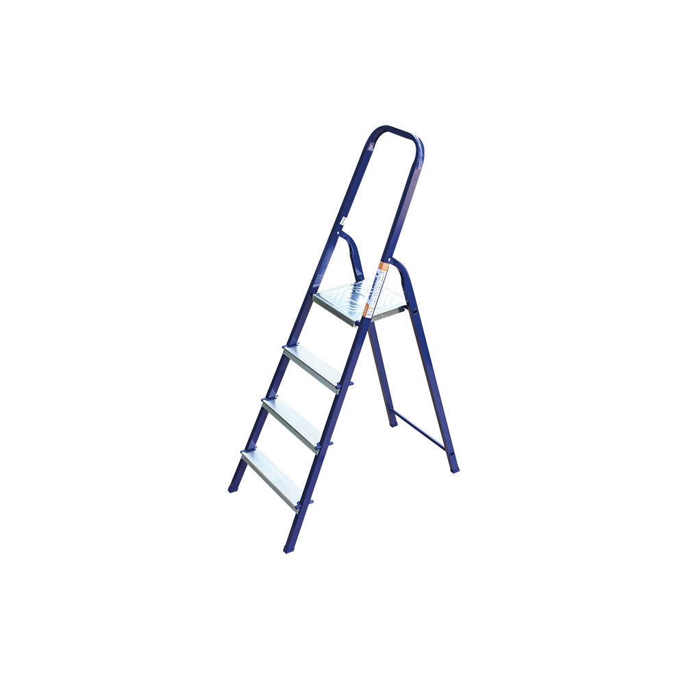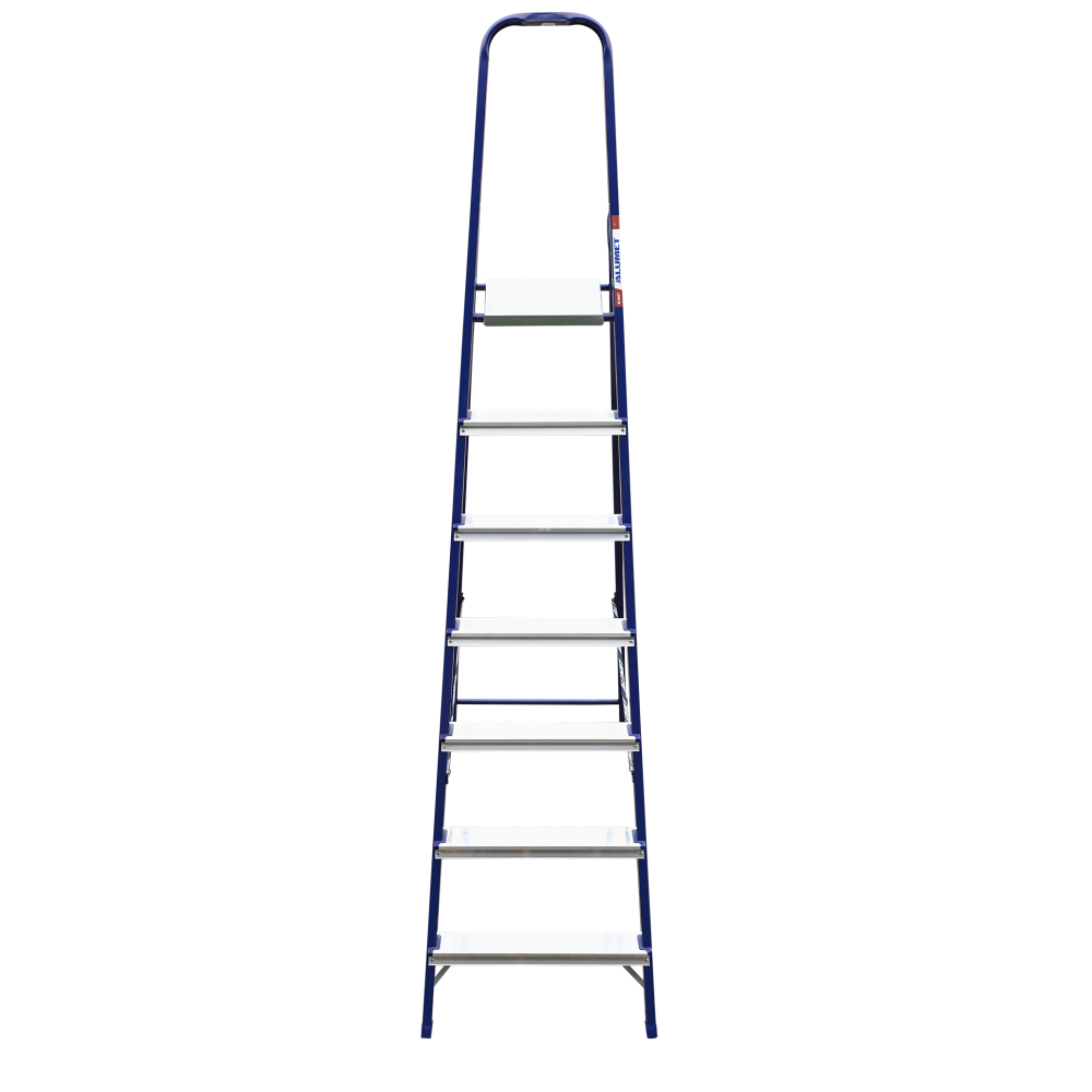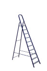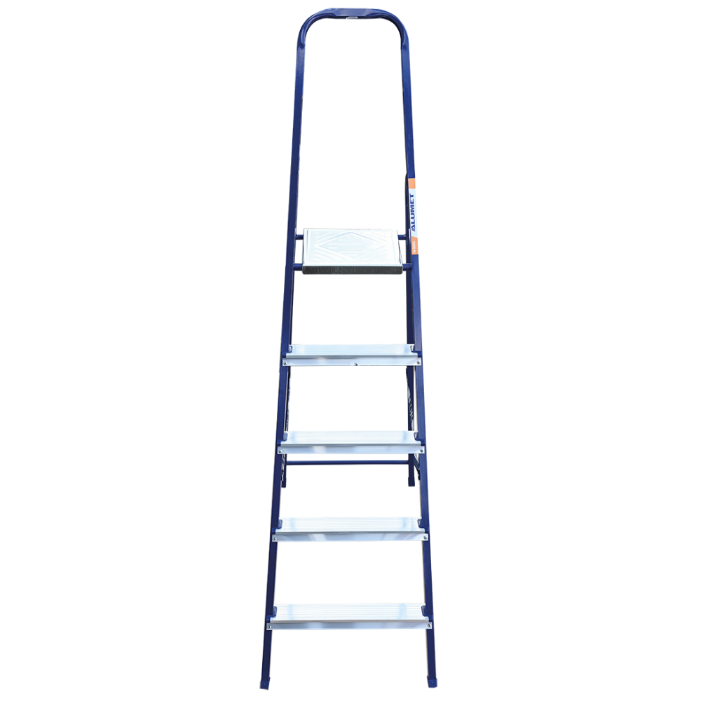 The strings of the step ladder are made of a high-strength steel shape protected against corrosion by epoxy powder enamel. The back and front legs are interconnected. The work platform is made of galvanized steel. The rungs have a serrated surface and are made of a high-strength aluminum shape. The shoes are made of high strength plastic. The step ladder in the working position is secured by the work platform; and for step ladders with five rungs and higher – by safety ropes. The number of rungs – from 3 to 10. M series aluminum step ladder is designed for various types of domestic and industrial work at a height of up to 4 m.