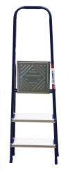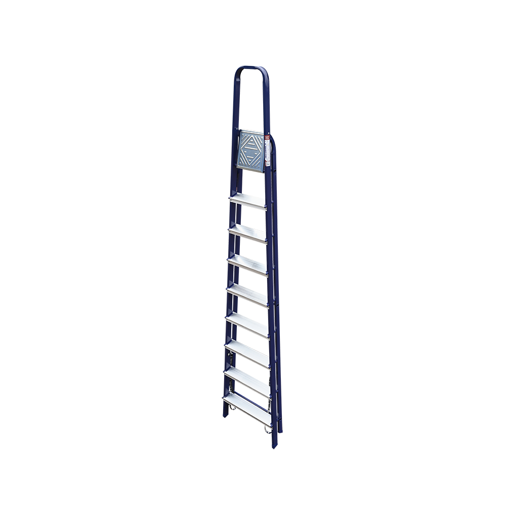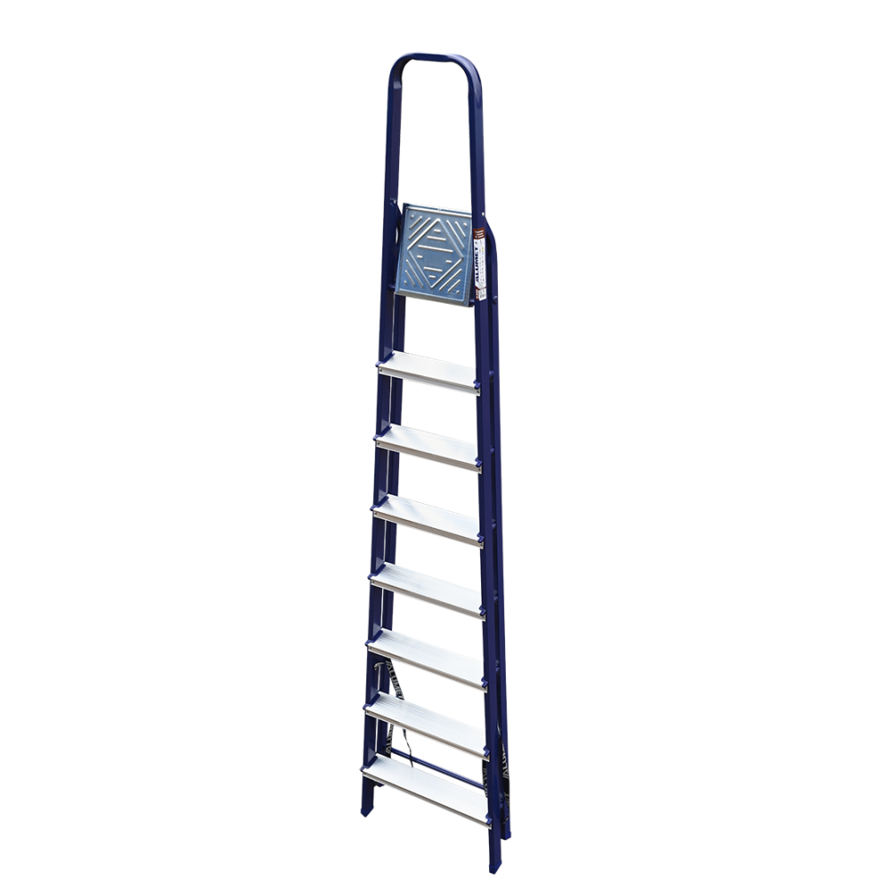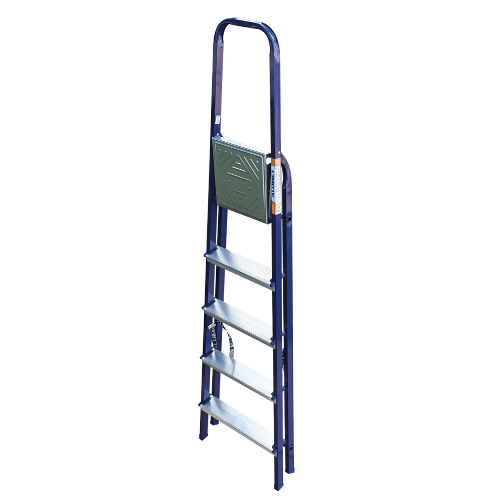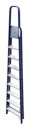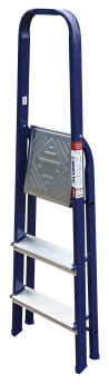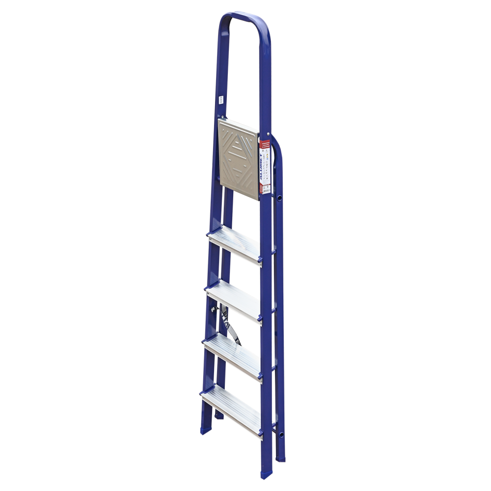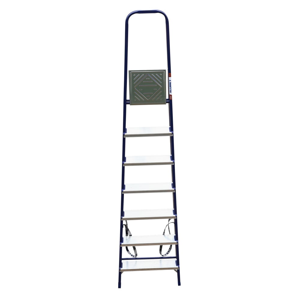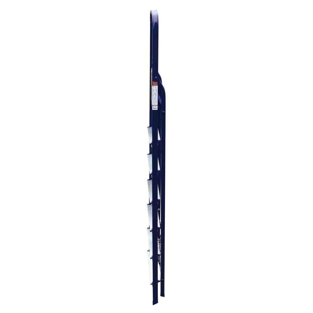 The strings of the step ladder are made of a high-strength steel shape protected against corrosion by epoxy powder enamel. The back and front legs are interconnected. The work platform is made of galvanized steel. The rungs have a serrated surface and are made of a high-strength aluminum shape. The shoes are made of high strength plastic. The step ladder in the working position is secured by the work platform; and for step ladders with five rungs and higher – by safety ropes. The number of rungs – from 3 to 10. M series aluminum step ladder is designed for various types of domestic and industrial work at a height of up to 4 m.
