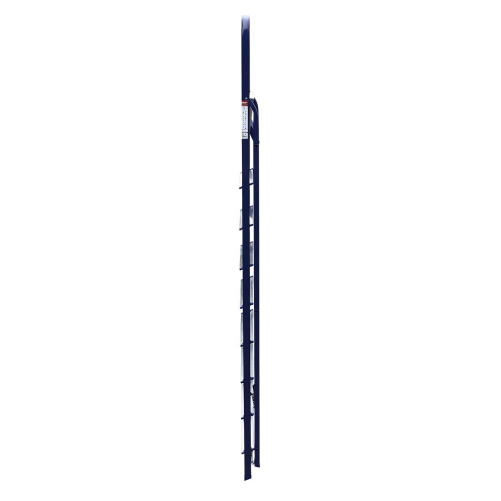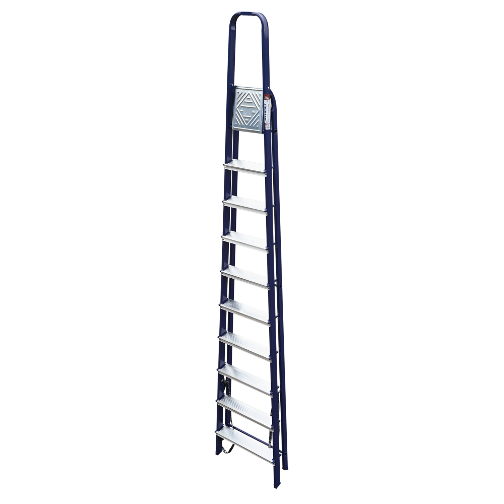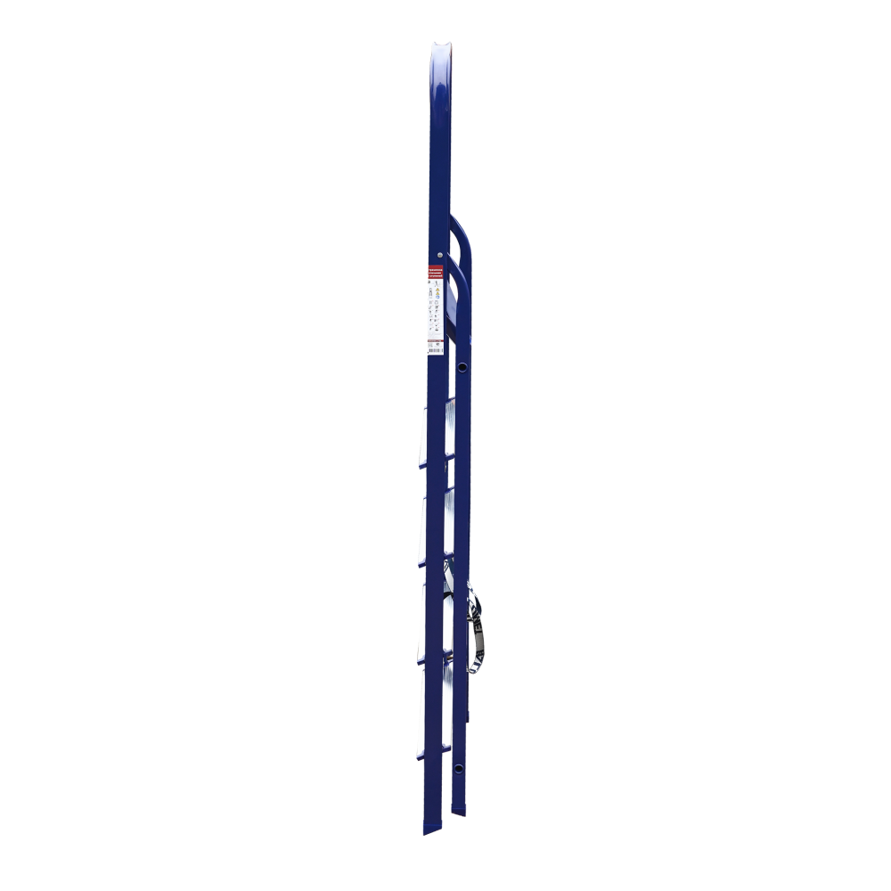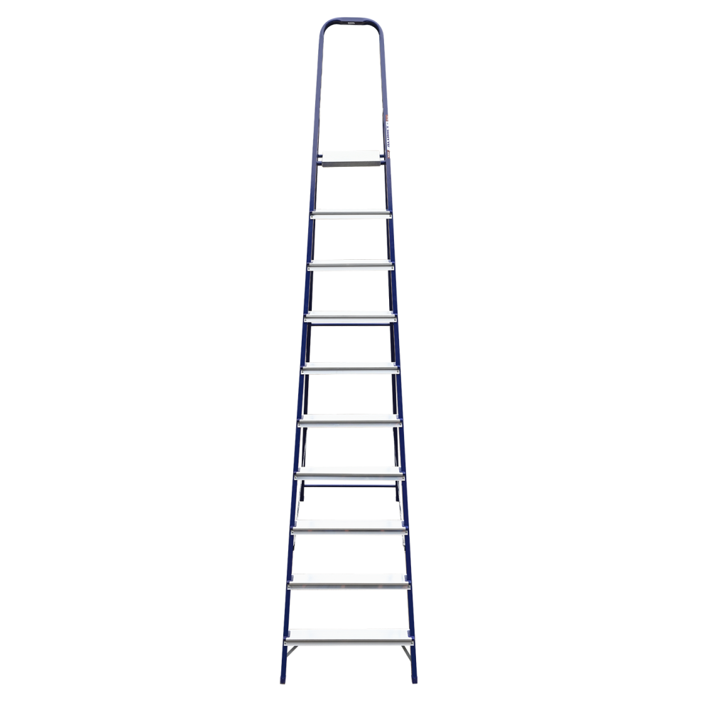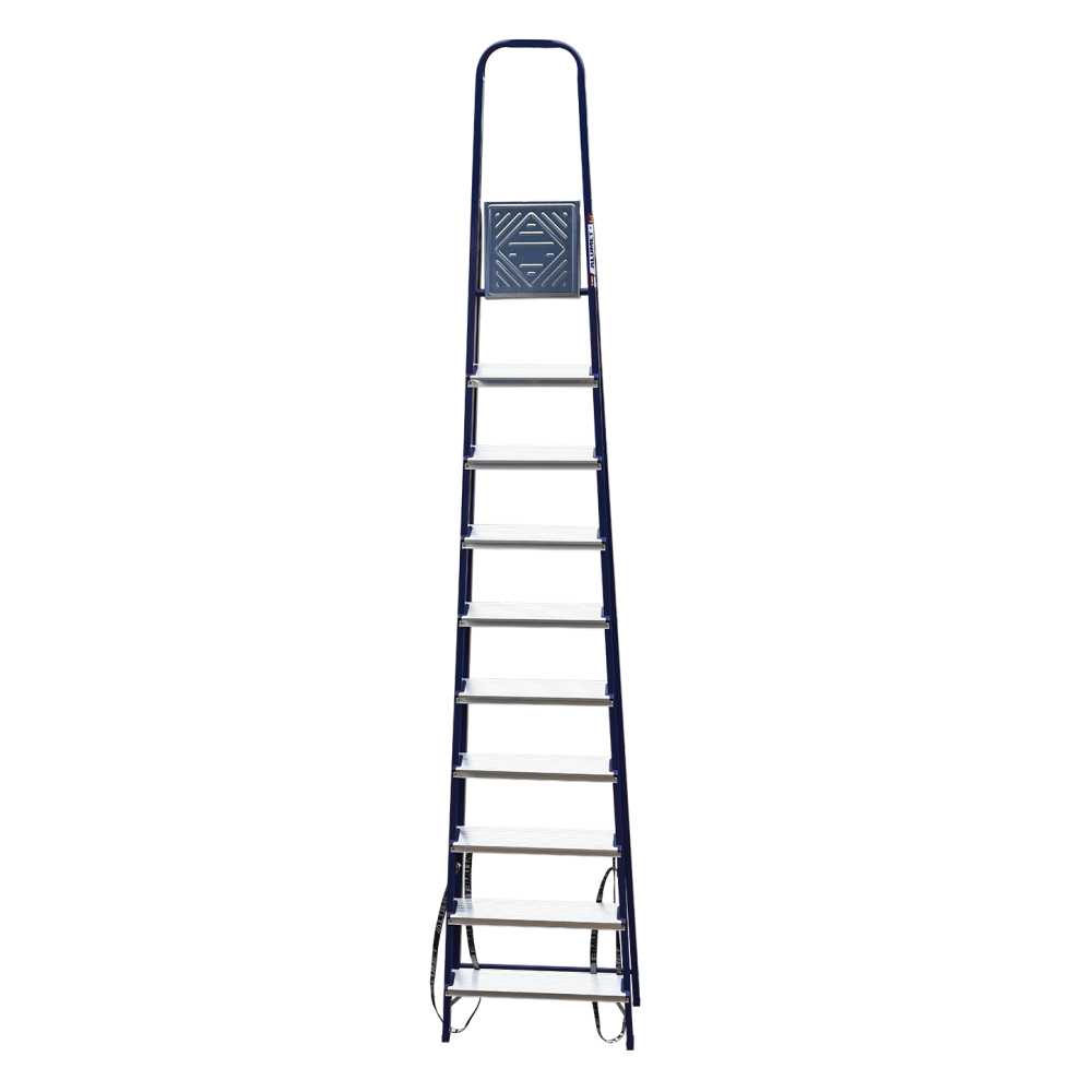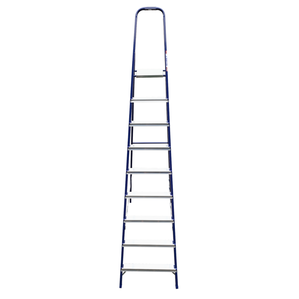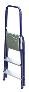 The strings of the step ladder are made of a high-strength steel shape protected against corrosion by epoxy powder enamel. The back and front legs are interconnected. The work platform is made of galvanized steel. The rungs have a serrated surface and are made of a high-strength aluminum shape. The shoes are made of high strength plastic. The step ladder in the working position is secured by the work platform; and for step ladders with five rungs and higher – by safety ropes. The number of rungs – from 3 to 10. M series aluminum step ladder is designed for various types of domestic and industrial work at a height of up to 4 m.